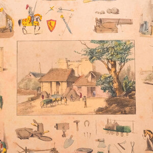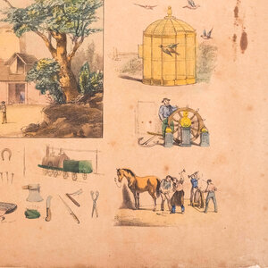Centsprent 'Bereiding en toepassing van ijzer'. Ingekleurde litho met afbeeldingen van de bereiding van ijzer en een aantal voorbeelden waarin ijzer wordt toegepast. Datering onbekend. Conditie: De prent heeft sporen van ouderdom. Verkleuring, vlekken, vouwtjes en kleine beschadigingen aan de randen. Afmetingen van papier prent: 32 x 45 cm.