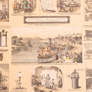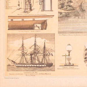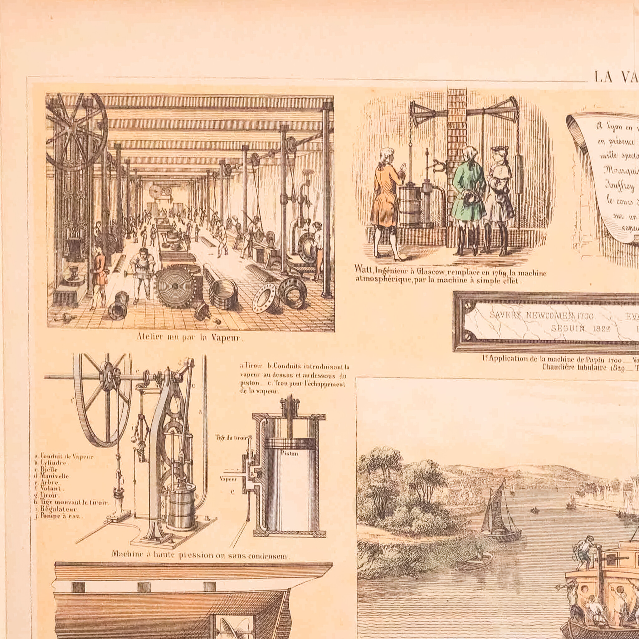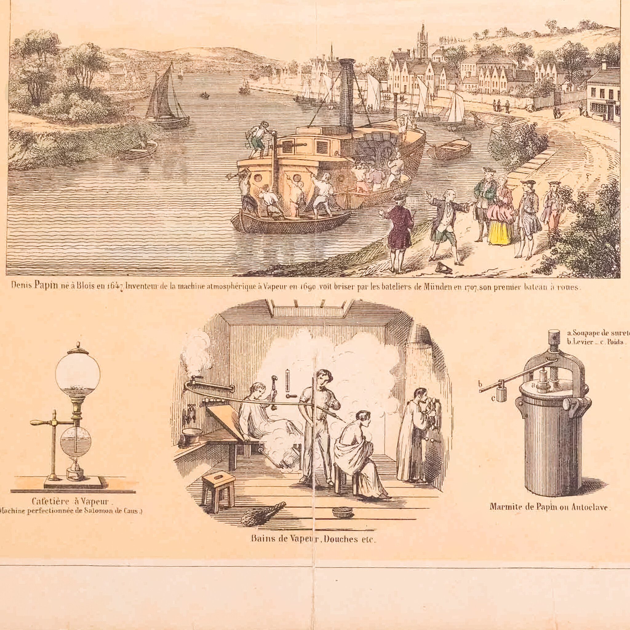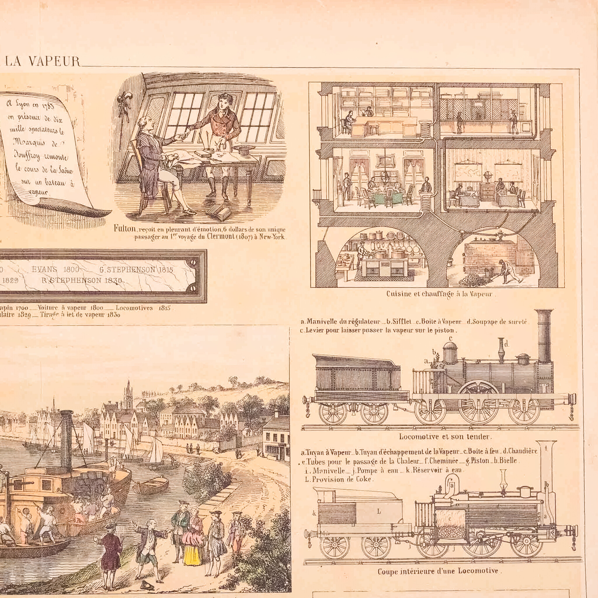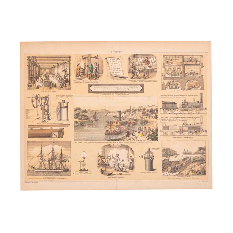 Centsprent 'La Vapeur'. Tekening en litho door Bethmont, uitgeverij Lemercier. Dubbele pagina illustratie in een van de series 'Les Récreations Instructives. Een prent met afbeeldingen van de ontdekking en toepassing van stoomdruk (spoorwegen, stoomvaart, industrie, geneeskunde, gastronomie). Parijs, Frankrijk. Datering: circa 1860. Conditie: De prent heeft sporen van ouderdom. Verkleuring, vlekken en kleine beschadigingen aan de randen. Afmetingen van papier prent: 30 x 39 cm.