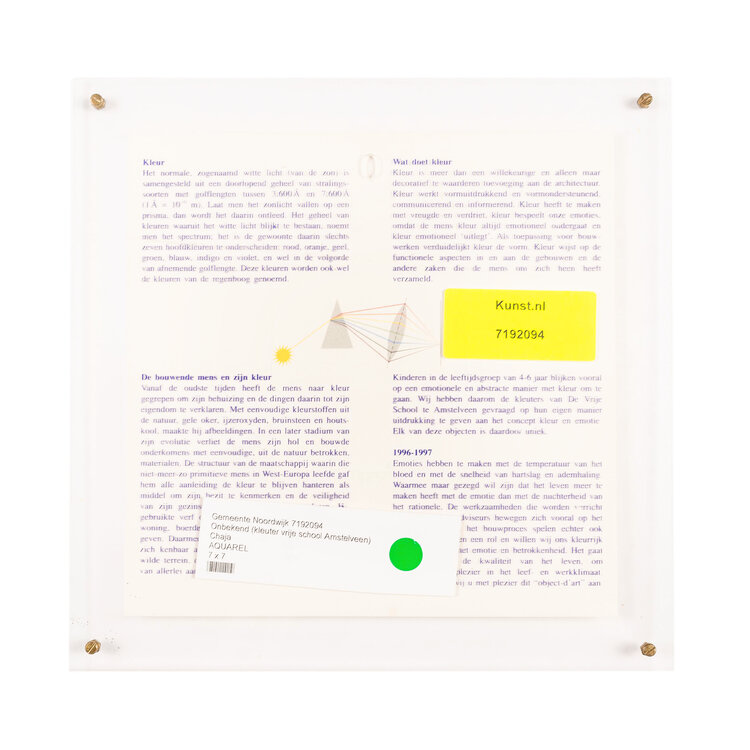Set van twee relatiegescheken van PKB Bouwadviseurs, beide tussen plexiglas. Chaja, 1996; een aquarel gemaakt door een kleuter van de vrije school in Amstelveen. Met het oog op 2000, 1999, door een onbekende kunstenaar; zeefdruk op plexiglas, oplage 500/5