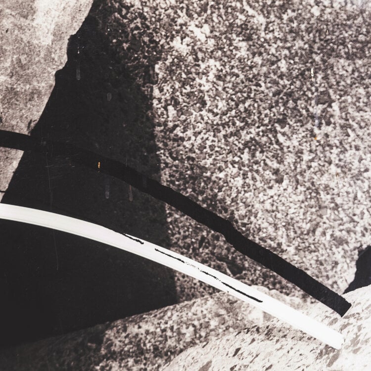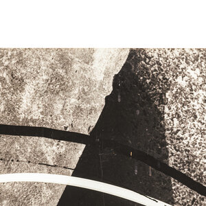 Clemens Zalm, Z.T. 9a, jaartal onbekend. Foto in plexiglas. Afbeelding van stenen, bewerkt met een zwarte en witte gebogen lijn. Conditie: gebruikssporen en vlekjes op het plexiglas. Afmeting: 43 x 57 cm