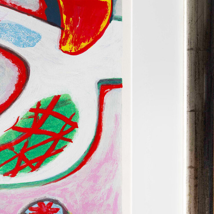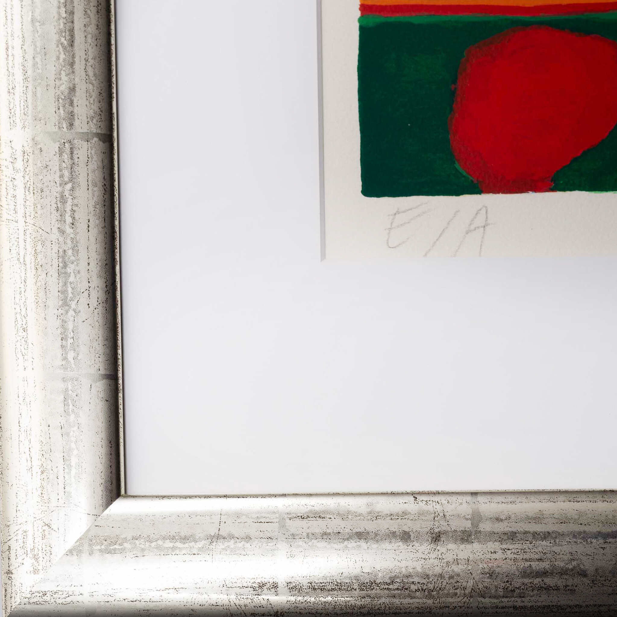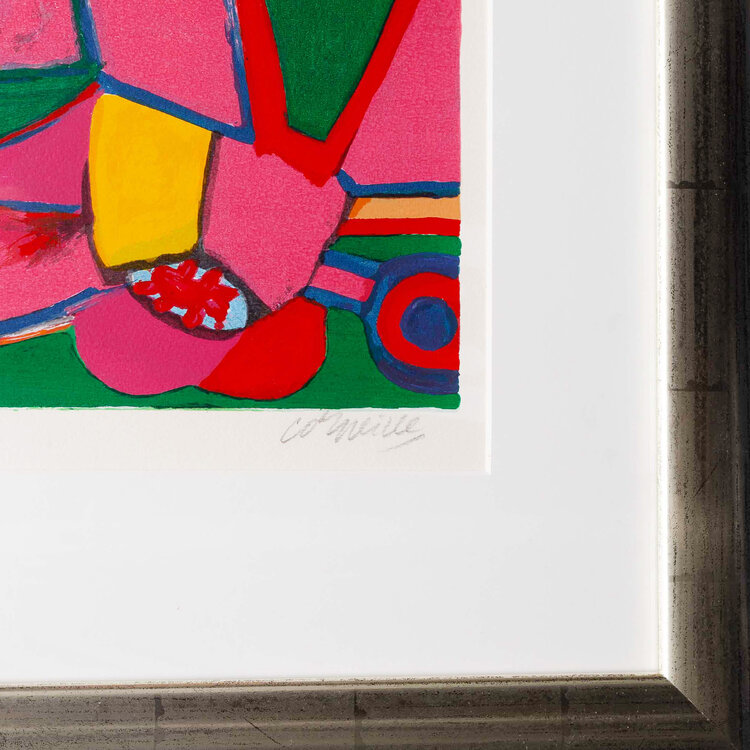 Corneille, 'Bain de soleil', jaartal onbekend. Zeefdruk in zilverkleurige lijst met passe-partout, oplage E/A. Abstracte veelkleurige voorstelling van twee figuren, vogels en verschillende vormen. Linksonder oplagenummer, rechtsonder signatuur. Conditie: goed, de lijst toont lichte gebruikssporen. Afmeting lijst: 110 x 108 cm.