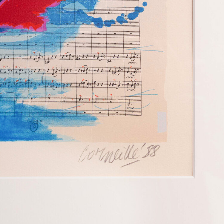 Corneille, Hommage aan Beethoven, 1988. Zeefdruk op papier in zilver-kleurige lijst, oplage 25/30. Afbeelding van een zwarte vogel met rode wolken en een zwarte maan boven rode bergen. Linksonderaan de krul van een strijkinstrumen tegen een blauwe achtergrond. Corneille visualiseert een compositie van Ludwig van Beethoven. Op de achtergrond is een fragment van de partituur van de compositie te zien. Uit de serigrafie 'Corneille en Componisten', uitgegeven ter gelegenheid van het 100-jarig bestaan van het Concertgebouw en het Concertgebouworkest in 1988. Linksonder oplagenummer, rechtsonder signatuur en jaar. Conditie: goed, de lijst toont lichte gebruikssporen. Afmeting lijst: 65 x 82,5 cm.