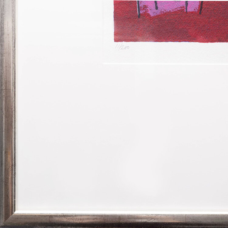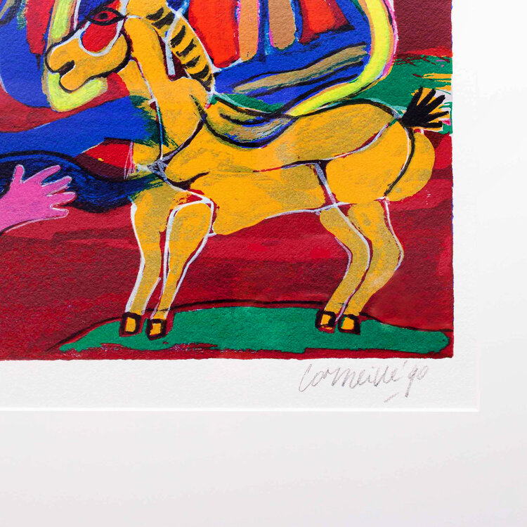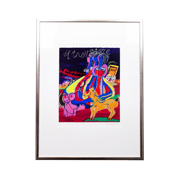 Corneille, 'Il Trovatore', 1990. Zeefdruk op papier in goudkleurige lijst, oplage 11/200. Scene uit de opera van Giuseppe Verdi. Afbeelding van vrouwen, een paard en een koets, in de kleuren rood, blauw, geel en zwart. Op het werk staat geschreven: "Il Trovatore". Afkomstig uit de serie: 'Hommage aan Verdi.' Linksonder oplagenummer, rechtsonder signatuur. Conditie: goed. Afmeting incl lijst: ca. 83 x 63 x 2 cm.