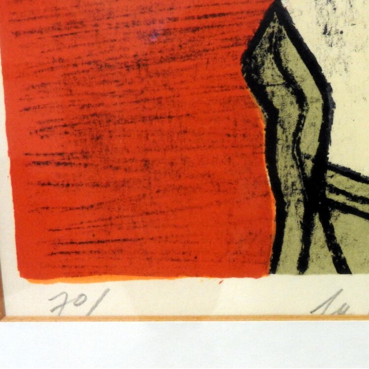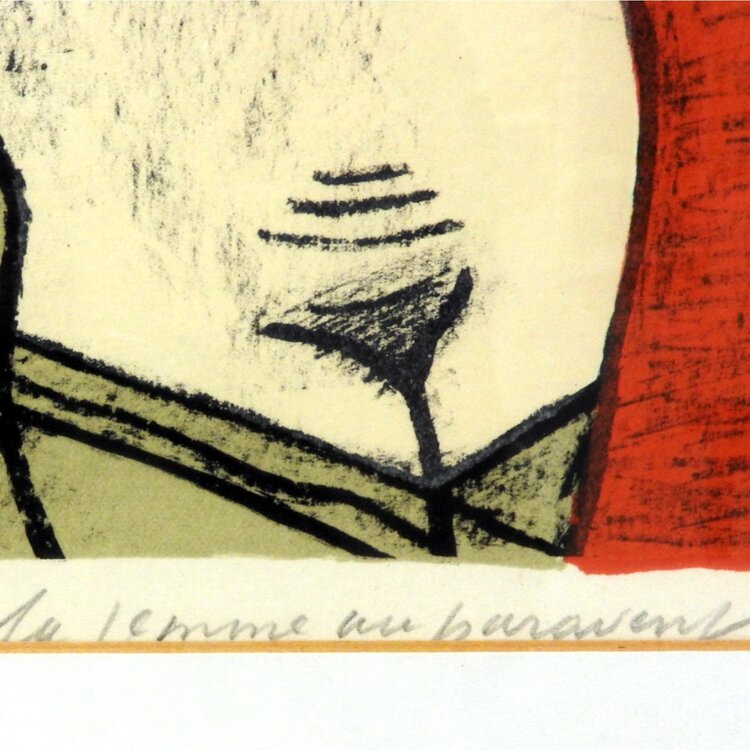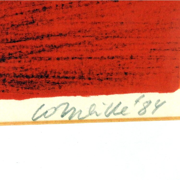Corneille, 'La femme au paravent', 1984. Kleurenlitho in zilverkleurige lijst met passe-partout, oplage 70 van vermoedelijk 125. Afbeelding van een naakte vrouw met een fantasiedier en een rode en een groene hand. Signatuur rechtsonder. Conditie: lijst beschadigd, stickerresten op glas; oplagenummer mogelijk onder passe-partout. Afmetingen lijst: hoogte 65 cm, breedte 52 cm. Afmetingen beeldvlak: hoogte 40 cm, breedte 28 cm.