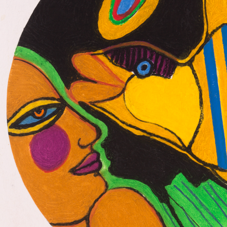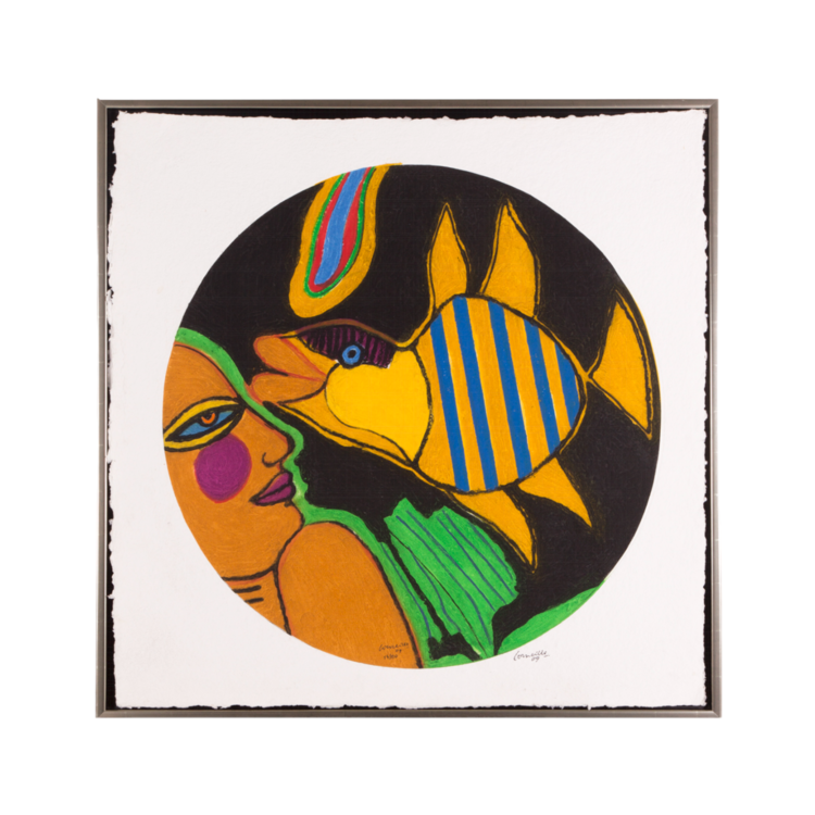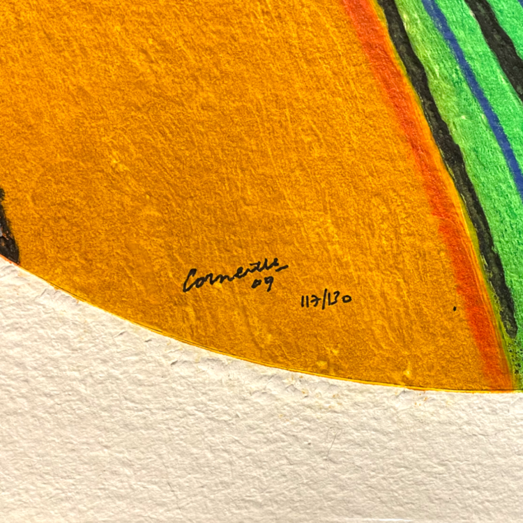 Corneille, 'L'Argentine, reine du tango', 2009. Gravure, oplage van 130. Voorstelling van een vrouw en een fantasiedier in een cirkelvormige compositie. Signatuur Corneille 09, midden onder. Corneille (1922-2010) was een schilder en grafisch kunstenaar die begin jaren vijftig de conservatieve Nederlandse kunstwereld radicaliseerde. Samen met vijf andere invloedrijke kunstenaars, waaronder Karel Appel en Constant, richtte hij in 1948 de naoorlogse Europese expressionistische beweging CoBrA op. Corneille volgde tussen 1940 en 1942 cursussen tekenen en etsen aan de Academie van Beeldende Kunsten in Amsterdam, maar wordt over het algemeen beschouwd als een autodidactische schilder. Aanvankelijk sterk beïnvloed door het werk van Picasso maakte Corneille abstract werk. Vanaf de late jaren zestig krijgt Corneille's werk een meer figuratief karakter. In dit werk zijn vogels, vrouwen en bloemen vaak het onderwerp. Conditie: het werk is in goede conditie. De lijst heeft lichte gebruikssporen. Afmetingen: werk 104 x 104 cm, lijst 108.8 x 108.8 cm.