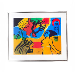 Corneille, Les Chiens, 2009. Litho op papier in zilverkleurige lijst, oplage 49/130. Kleurrijke voorstelling met en vrouw en groepje honden, in het midden hangt een vogel. Signatuur Corneille 09, midden onder. Conditie: goed. Afmeting lijst ca. 102 x 125 cm.