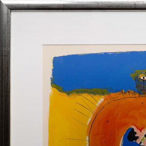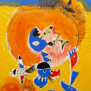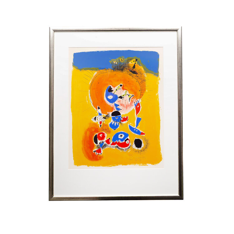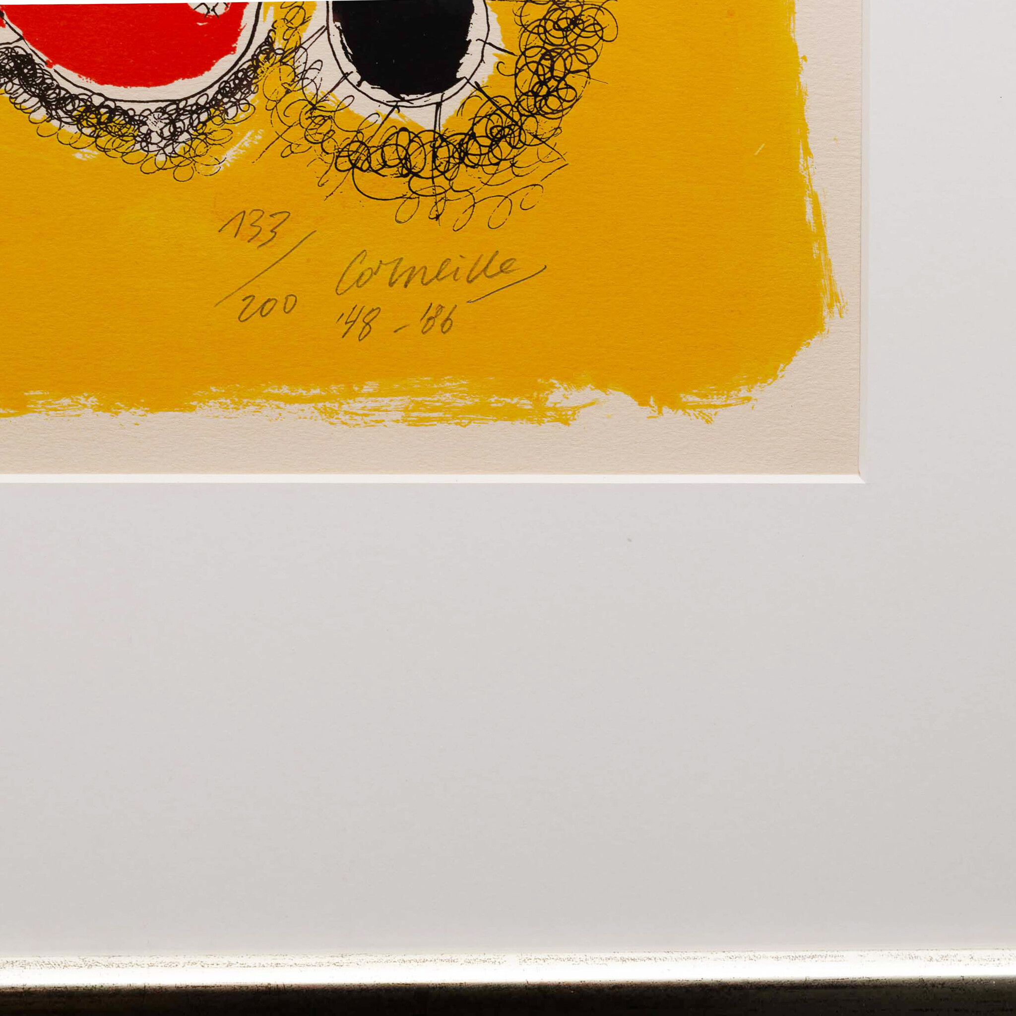 Corneille, 'Les Yeux d'enfance et le grand Soleil', 1986. Zeefdruk op papier in zilver kleurige lijst, oplage 133/200. Kleurrijke compositie van diverse figuren in rood en blauw voor een gele achtergrond, met oranje vlakken. Een herdruk uit 1986 van het originele werk dat Corneille in zijn vroege CoBrA-tijd in 1948 heeft geschilderd. Signatuur rechtsonder "Corneille '48-'86". Conditie: goed. Afmetingen lijst: 71 x 56 cm.