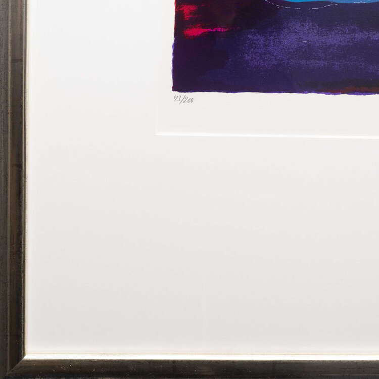 Corneille, 'Six Rêves Peints III', 1989. Zeefdruk op papier in zilver kleurige lijst, oplage 43/200. Compositie met een vrouw en twee paarden voor een donker blauwe achtergrond. Signatuur rechtsonder "Corneille '89". Het werk is afkomstig uit de serie 'Six Rêves Peints' (zes geschilderde dromen), geïnspireerd door het werk van Lewis Carroll, George Luis Borges, Henry Micaux, Antonio Machado, Paul Edward en Gaston Bachelard. Conditie: goed. Afmetingen lijst: 83 x 63 cm.
