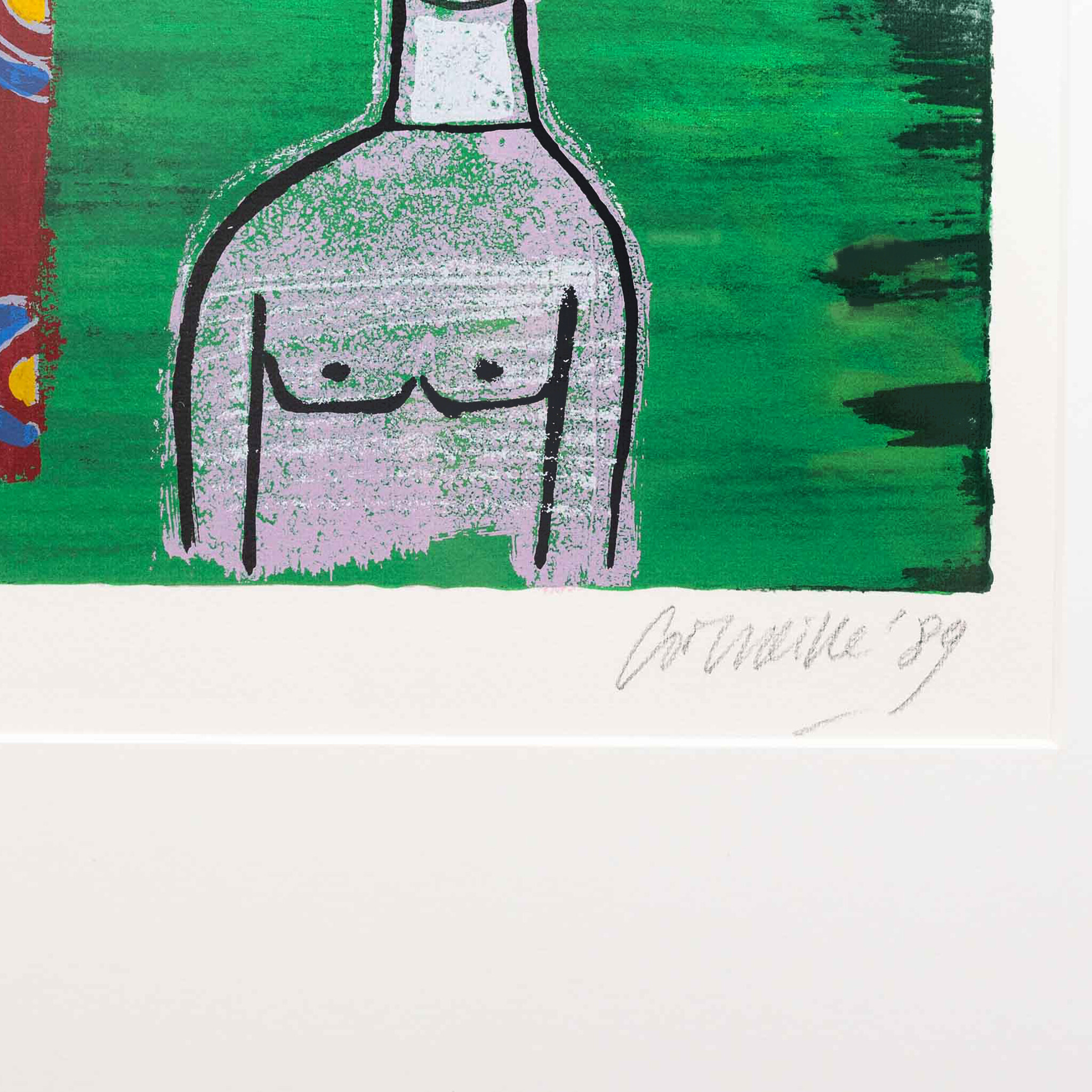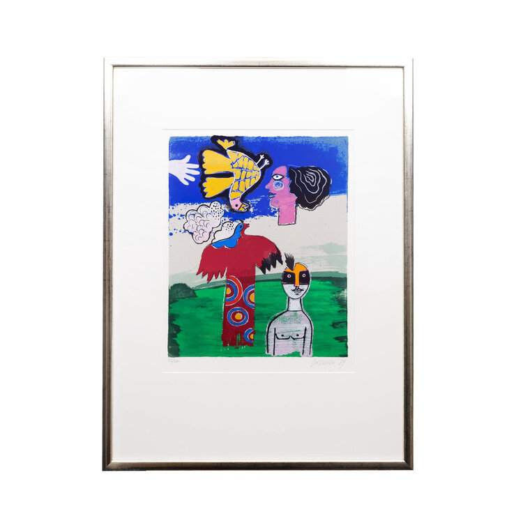 Corneille, 'Six Rêves Peints VI', 1989. Zeefdruk op papier in zilver kleurige lijst, oplage 43/200. Compositie van een man met masker en in de lucht twee vogels en kop van een vrouw en profil. Signatuur rechtsonder "Corneille '89". Het werk is afkomstig uit de serie 'Six Rêves Peints' (zes geschilderde dromen), geïnspireerd door het werk van Lewis Carroll, George Luis Borges, Henry Micaux, Antonio Machado, Paul Edward en Gaston Bachelard. Conditie: goed. Afmetingen lijst: 83 x 63 cm.