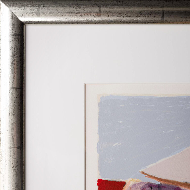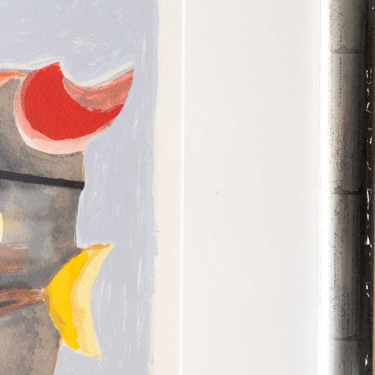 Corneille, 'Spelend kind', 1988. Zeefdruk op papier in zilver kleurige lijst, oplage 28/200. Compositie van diverse figuren en objecten voor een grijze achtergrond. Signatuur rechtsonder "Corneille '88". Conditie: goed. Afmetingen lijst: 72 x 78 cm.