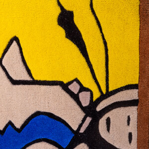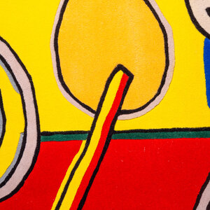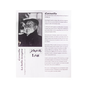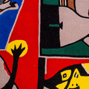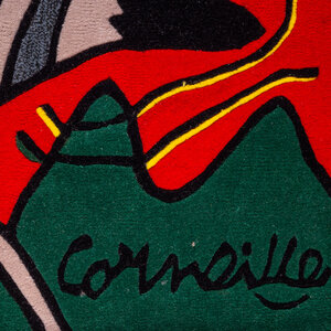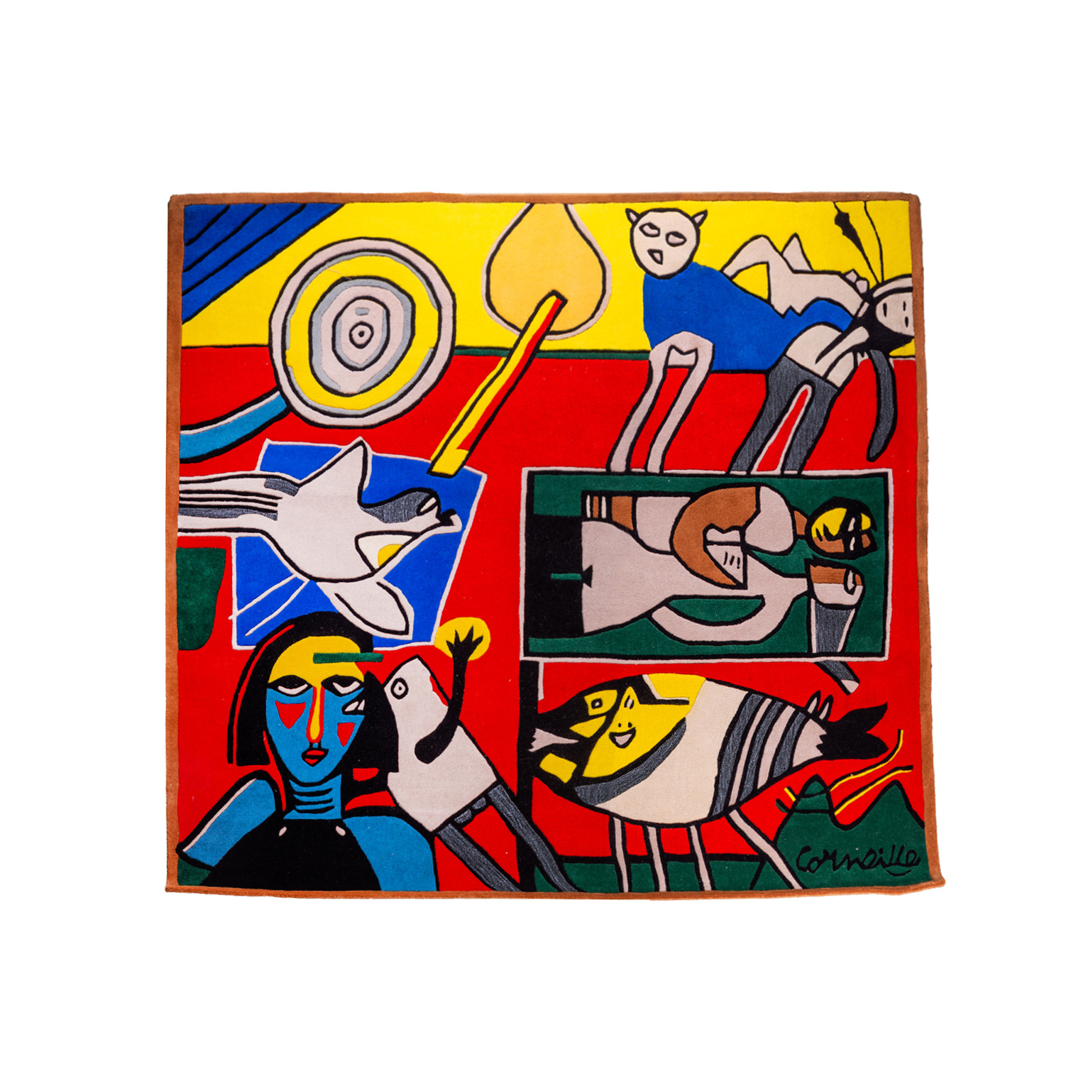 Corneille, Tapijt 'La belle écuyère', 1999. Handgetuft wollen vloer- of wandkleed, oplage 3/125. Afgebeeld is een kleurruhje compositie met personen en dieren voor een rode achtergrond. Rechtsonder de signatuur 'Corneille'. Een gesigneerd papieren certificaat van echtheid wordt meegeleverd. Corneille (1922-2010) was een schilder en grafisch kunstenaar die begin jaren vijftig de conservatieve Nederlandse kunstwereld radicaliseerde. Samen met vijf andere invloedrijke kunstenaars richtte hij in 1948 de naoorlogse Europese expressionistische beweging CoBrA op. Aanvankelijk sterk beïnvloed door het werk van Picasso maakte Corneille abstract werk. Vanaf de late jaren zestig krijgt Corneille's werk een meer figuratief karakter. In dit werk zijn vogels, vrouwen en bloemen vaak het onderwerp. Conditie: als nieuw. Afmetingen: ca. 220 x 220 cm.