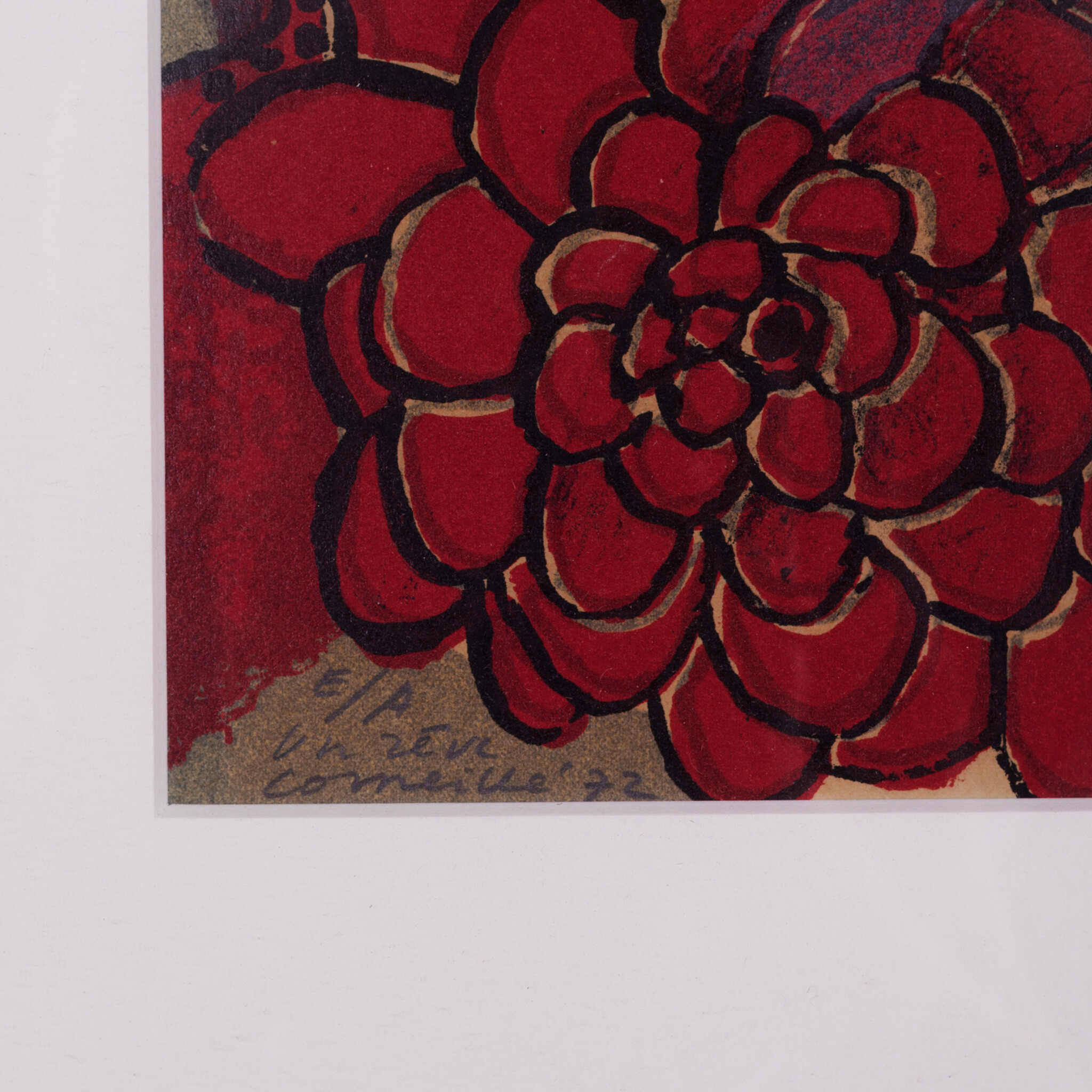 Corneille, 'Un rêve', 1972. Litho in zilverkleurige lijst met passe-partout, oplage E/A. Onderin een portret van een vrouw en profil met erboven een vlinder en rode bloem voor een zwarte achtergrond. Signatuur linksonder. Corneille (1922-2010) was een schilder en grafisch kunstenaar die begin jaren vijftig de conservatieve Nederlandse kunstwereld radicaliseerde. Samen met vijf andere invloedrijke kunstenaars richtte hij in 1948 de naoorlogse Europese expressionistische beweging CoBrA op. Aanvankelijk sterk beïnvloed door het werk van Picasso maakte Corneille abstract werk. Vanaf de late jaren zestig krijgt Corneille's werk een meer figuratief karakter. In dit werk zijn vogels, vrouwen en bloemen vaak het onderwerp. Conditie: goed, met lichte gebruikssporen aan de lijst. Afmetingen passe-partout: 65 x 50 cm; lijst: 90 x 72 cm.
