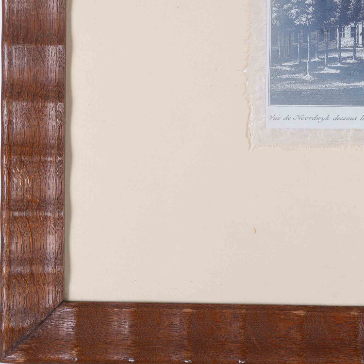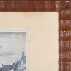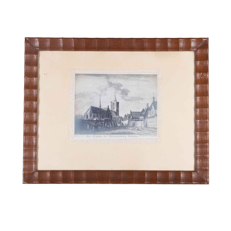 Dirk Pander, drie facsimile afdrukken van etsen met historische zichten op Noordwijk. 'De Kerk te Noordwijk Binne' door Hendrik Spilman, 'Gesigt van het Proveniers huys en Vismarkt, tot Noordwyk binnen', door onbekende kunstenaar en 'Gesigt tot Noordwyk binnen onder de Linden' door onbekende kunstenaar. De afdrukken zijn bevestigd op een soort zijde-papier en ingelijst in houten lijst met passe-partout. Rechtsonder is 'D. Pander Leiden' in het papier geëmbosst. Dirk Pander in 1895-1933 werkzaam in Leiden als retoucheur en fotograaf. Conditie: De achterbladen zijn wat vergeeld en de lijsten tonen gebruikssporen. Afmeting per lijst: 39 x 48 cm.
