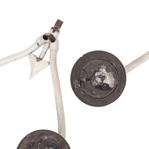 Set bestaande uit: een goud gedecoreerde kaarsendover in schaarmodel, een blauw geglazuurde aardewerk kaarsenstandaard en twee wand kandelaars met nog kaarsvet resten erin. In een van deze loopt elektriciteitsdraad, wat doet vermoeden dat er ooit lampjes op gezeten hebben. Datering: onbekend. Conditie: sporen van gebruik en ouderdom. Afmetingen: 7 x ø 26 cm (en ø 2,5 cm gat), 18 x 5,3 cm en 16 x 25 cm.