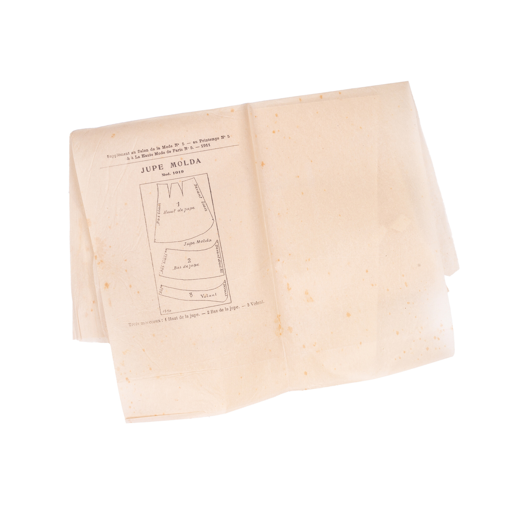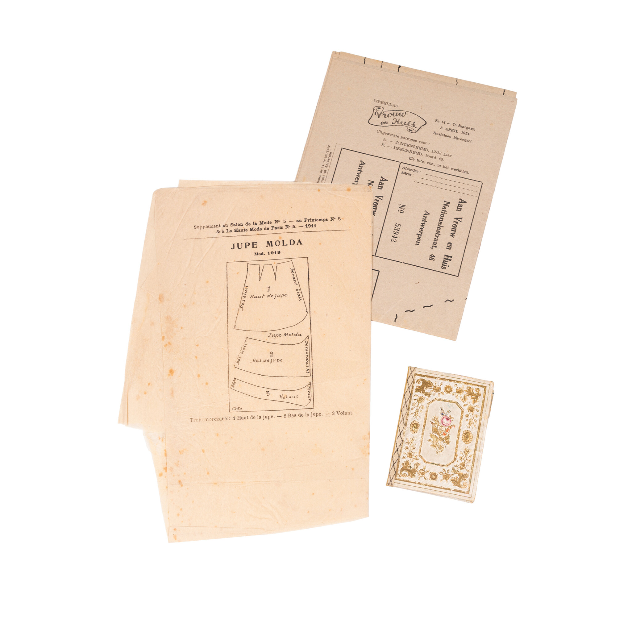 Diverse patronen, eerste helft 20ste eeuw. Naaipatroon voor een jupe molda, Mod. 1019. 'supplément au Salon de la Mode N° 5 - au Printemps N° 5 & à La Haute Mode de Paris N° 5 - 1911'; Naaipatroon voor een jongens/herenhemd, kosteloos bijvoegsel , nr 14 - 7e jaargang, 8 april 1954, Antwerpen; Duits patroonboekje met borduurpatronen voor kruissteek, met oa cijfers, letters en kleine afbeeldingen. Conditie: gebruikssporen, foxing in Frans patroon. Afmetingen: variërend van ca. 9,5 x 6,5 cm tot 85 x 61 cm.