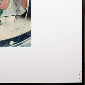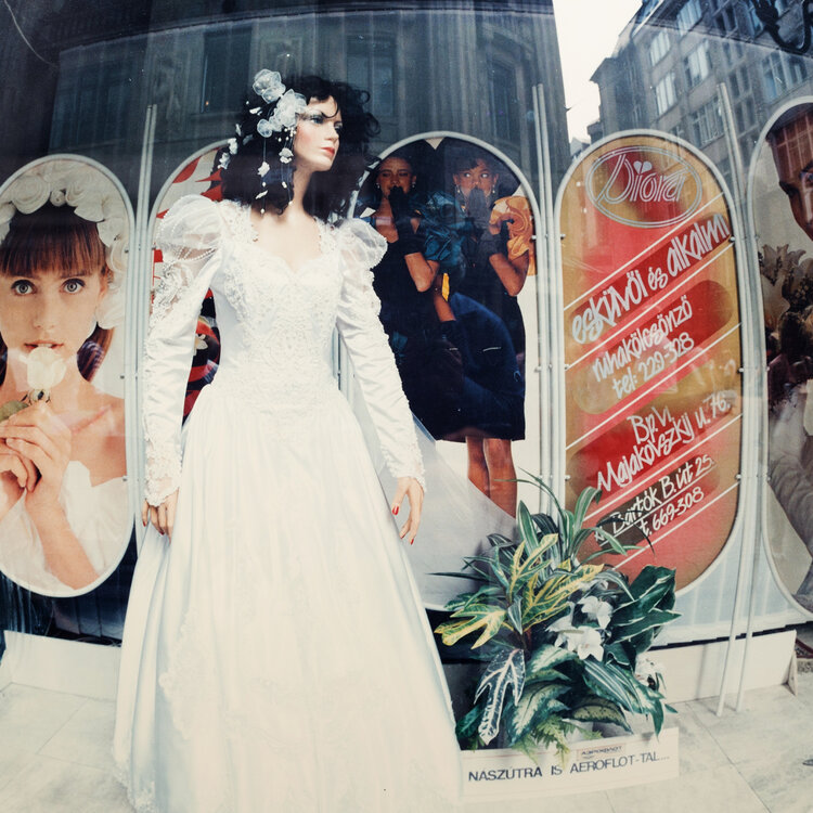 Dömötör, 'Etalage met bruidsjurk'. Kleurenfoto van een paspop met bruidsjurk, staand in een etalage omringd met bruidsfoto's. In donkergrijs metalen lijst met passe-partout. Datering onbekend. Conditie: rechtsonder barst in het glas, foto is in goede staat. Afmetingen lijst: 64,5 x 76,5 cm; beeldvlak: 40 x 39,5 cm.
