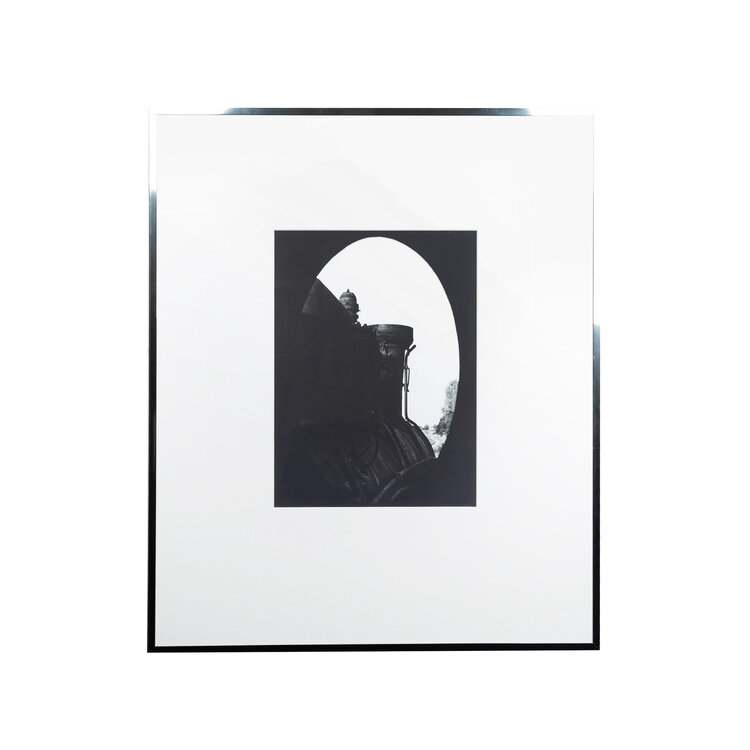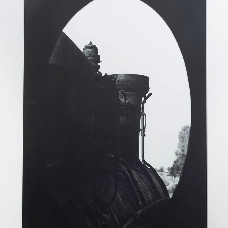Dömötör, 'Locomotief', datering onbekend. Zwart-witfoto in een metalen lijst met passe-partout. Afbeelding van een schoorsteen van een stoomlocomotief in een zwart kader. Signatuur ontbreekt. Conditie: kleine vouwtjes in papier van de foto, beschadigingen aan lijst. Afmetingen: beeldvlak 39 x 28,5 cm; lijst 76,5 x 64,5 cm.