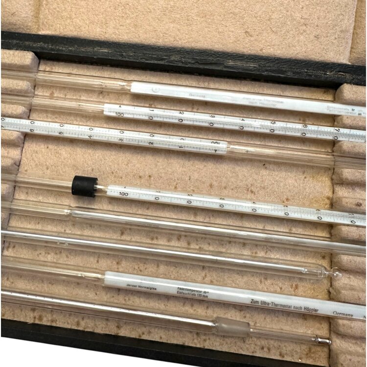 Doosje met acht kwikthermometers van Duitse makelij. Datering: 20ste eeuw. Conditie: incompleet en gebruikssporen, maar verder nog in goede staat. Afmetingen doos: lengte 49 cm, breedte 19 cm, hoogte 3 cm.