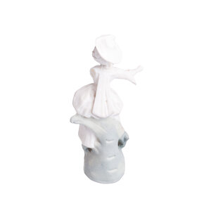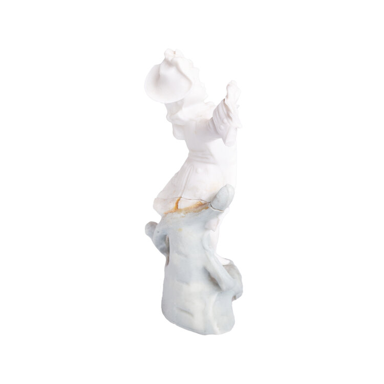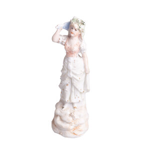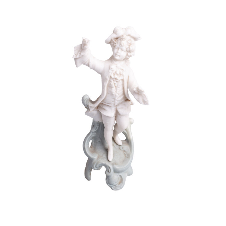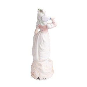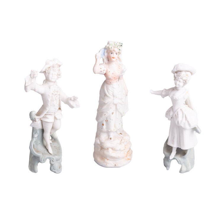 Drie beeldjes van biscuitporselein. Setje van een dame en een heer: een adellijke dame op groen voetstuk met grote hoed op krullenbol. Lange witte jurk op heupen breed gedrapeerd met 3/4 mouw. En een heer (jonker) op opengewerkt groengekleurd voetstuk met hoed op krullenbol, pandjesjas met daaronder vest (ca.10 x 5 x 5 cm); Beeldje van een dame met lang haar en in rechterhand een haarborstel. Zij heeft een lange witte jurk van goudstippen voorzien, boven- borststuk roze gekleurd (ca.12 x 4 x 4 cm). Datering: onbekend. Conditie: van het setje met de dame en de heer is de heer gebroken en gelijmd, de dame mist een arm.