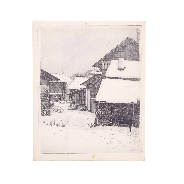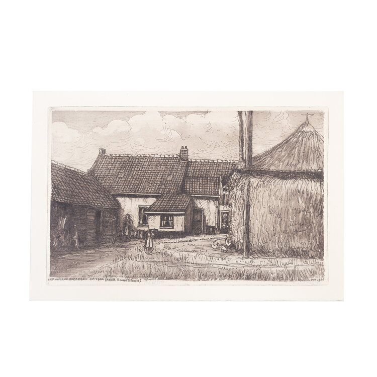 Drie etsen van Karel Kok zonder lijst. Erf museumboerderij ca 1900 (naar D. Nooteboom), 1984, oplage 11/250 met daarop afgebeeld de Museumboerderij in Noordwijk met twee figuren en een drietal kippen. Mollens, 1973 met daarop afgebeeld een kijkje tussen een aantal woningen in Mollens (Zwitserland) in de sneeuw. Geen titel, 1987, oplage 6/500; met een straatbeeld in de winter met op de achtergrond een kerktoren. Conditie: hier en daar gebruiksspren en verkleuring. Afmetingen: 33 x 22,5 cm - 17,5 x 13 cm.