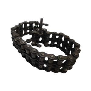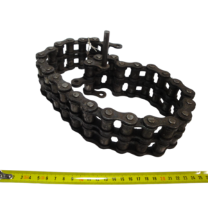 Ketting voor een mechaniek van metaal. Twee kettingen van metaal voor een machine. Snaar van textiel met spijkers of nagels. Datering: onbekend. Conditie: redelijk tot goed. Afmetingen kettingen: ca. 5,0 x 3,0 x 200,0 cm en 12,0 x 2,0 cm en 6,0 x 4,5 cm. Afmetingen snaar: ca. 198,0 x 3,5 x 3,5 cm.