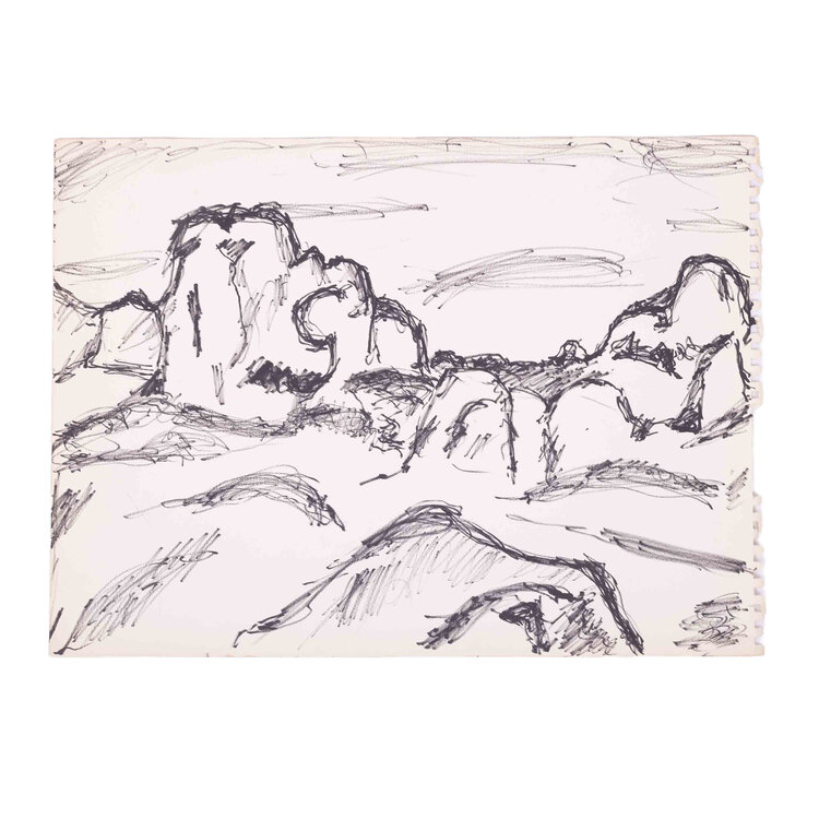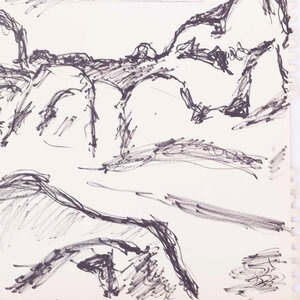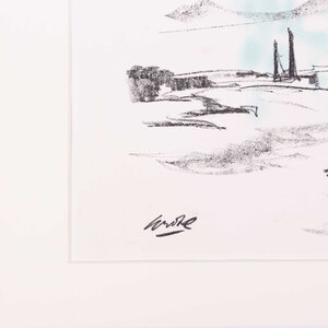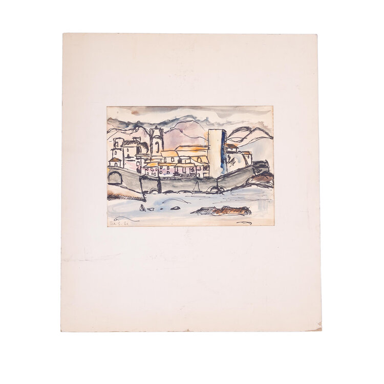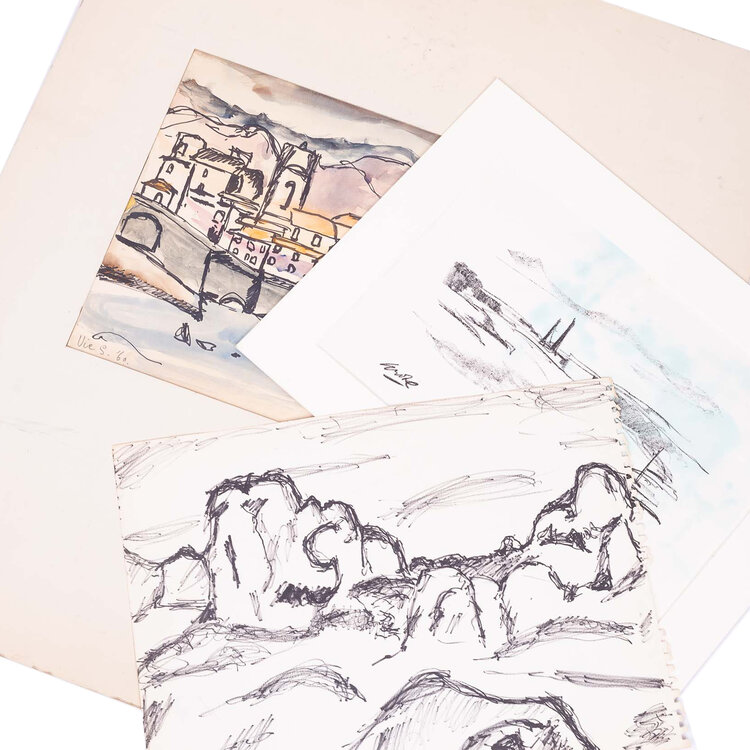 Drie landschappen, landschap in passepartout ingekleurd met aquarel gesigneerd Vic S. '60, vermoedelijk Vic Swagemakers, de zoon van Theo Swagemakers. Een schets van berglandschap met viltstift op schetspapier. Landschap in zwart gesigneerd linksonder met lichtblauwe gloed. Conditie: De tekeningen zijn in goede staat. De passepartout van het werk van Vic S is beschadigd en verkleurd. Afmetingen: Landschap Vic S 64 x 56 cm. Landschap in viltstift: 27 x 37 cm. Landschap blauw: 40 x 40