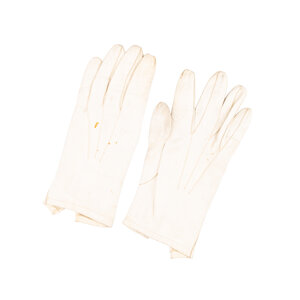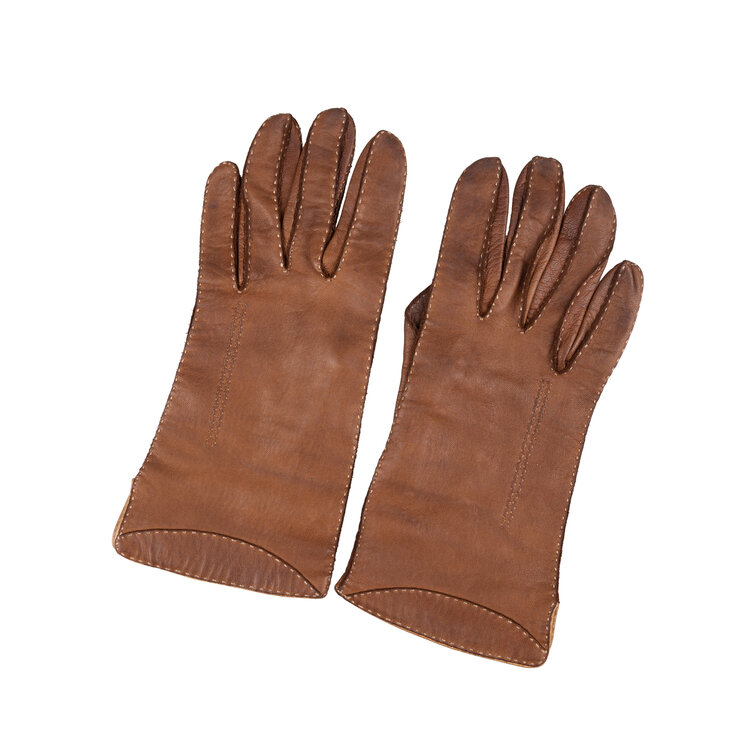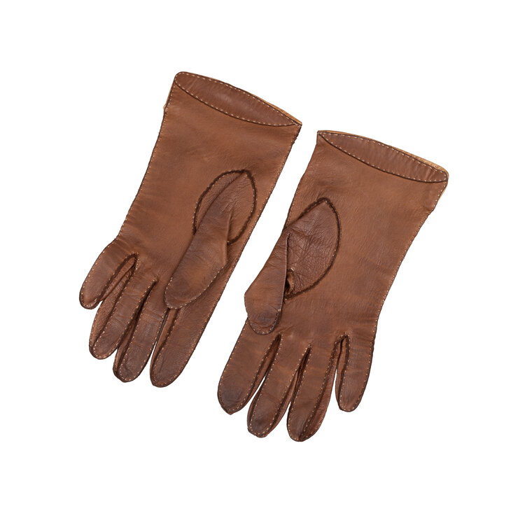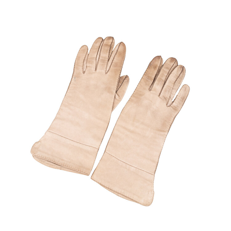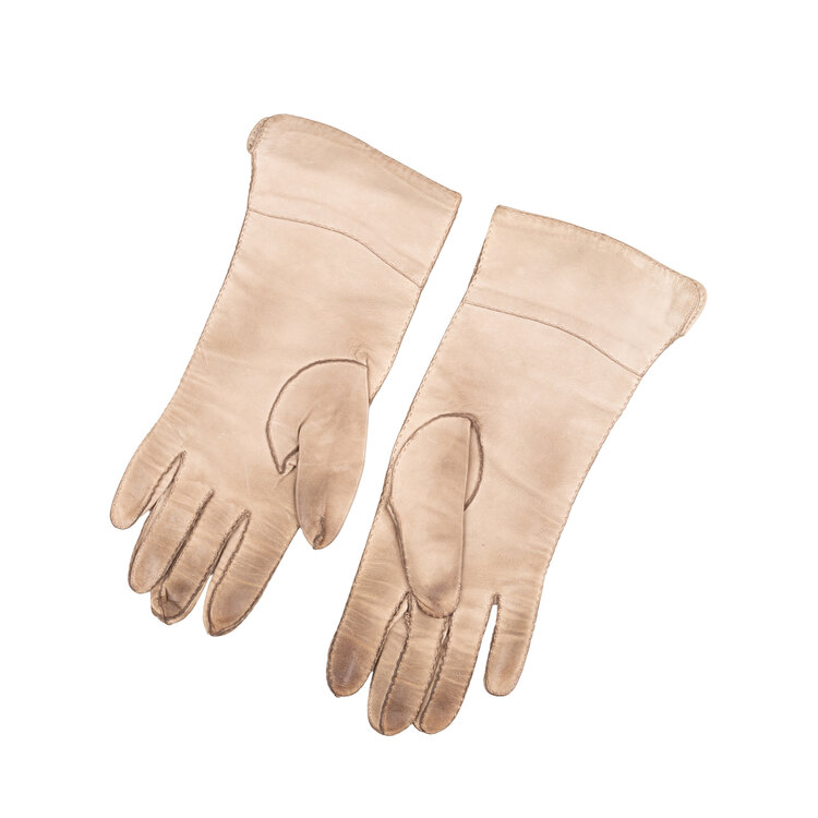 Drie paar leren handschoenen, 20ste eeuw. De handschoenen, ca. maat 8 1/2, zijn in de kleuren crème, lichtbruin en donkerbruin. Conditie: vertonen gebruikssporen, vlekjes. Afmetingen: variërend van ca. 23 x 8,5 cm tot ca. 28 x 9,5 cm.