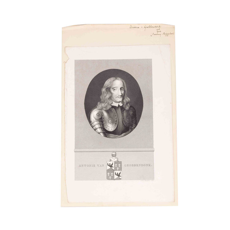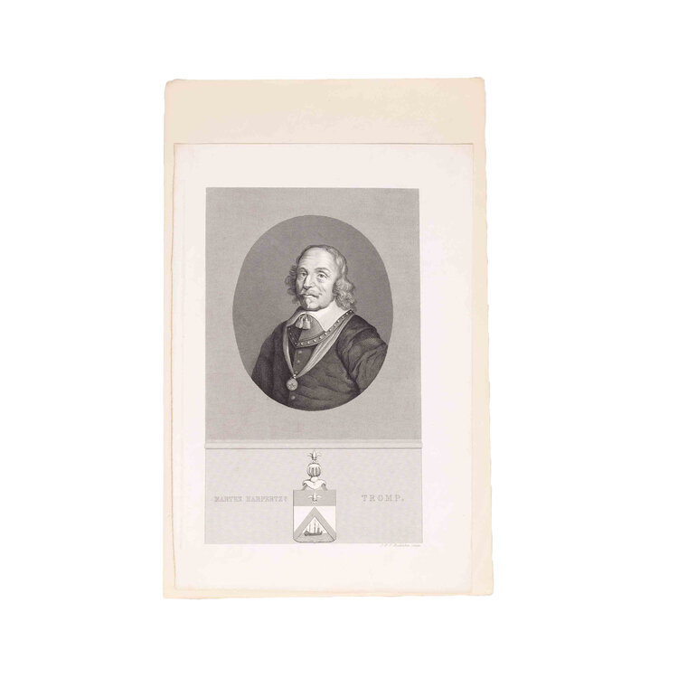 Prent 'Marten Harpertzn Tromp' (Den Briel, circa 23 april 1598 - Slag bij Ter Heijde (Scheveningen), 10 augustus 1653) door J.F.C. Reckleben; Prent 'Antonie van Grobbendonk' (Antwerpen, juli/ augustus 1564 - Brussel, 1641), door J.F.C. Reckleben; Prent 'Filips van Dorp' (1587-1652), Luitenant-Admiraal van Zeeland, door C.E. Taurel. Staalgravures. De prenten hebben middenonder een wapen en zijn zwart-wit. Datering: ca. 1850-1860. Conditie: De prenten vertonen sporen van ouderdom. Verkleuring, vlekken en kleine beschadigingen aan de randen. De prenten zijn geplakt op een vel. Afmetingen beeldvlak prenten: ca. 21 x 14 cm.