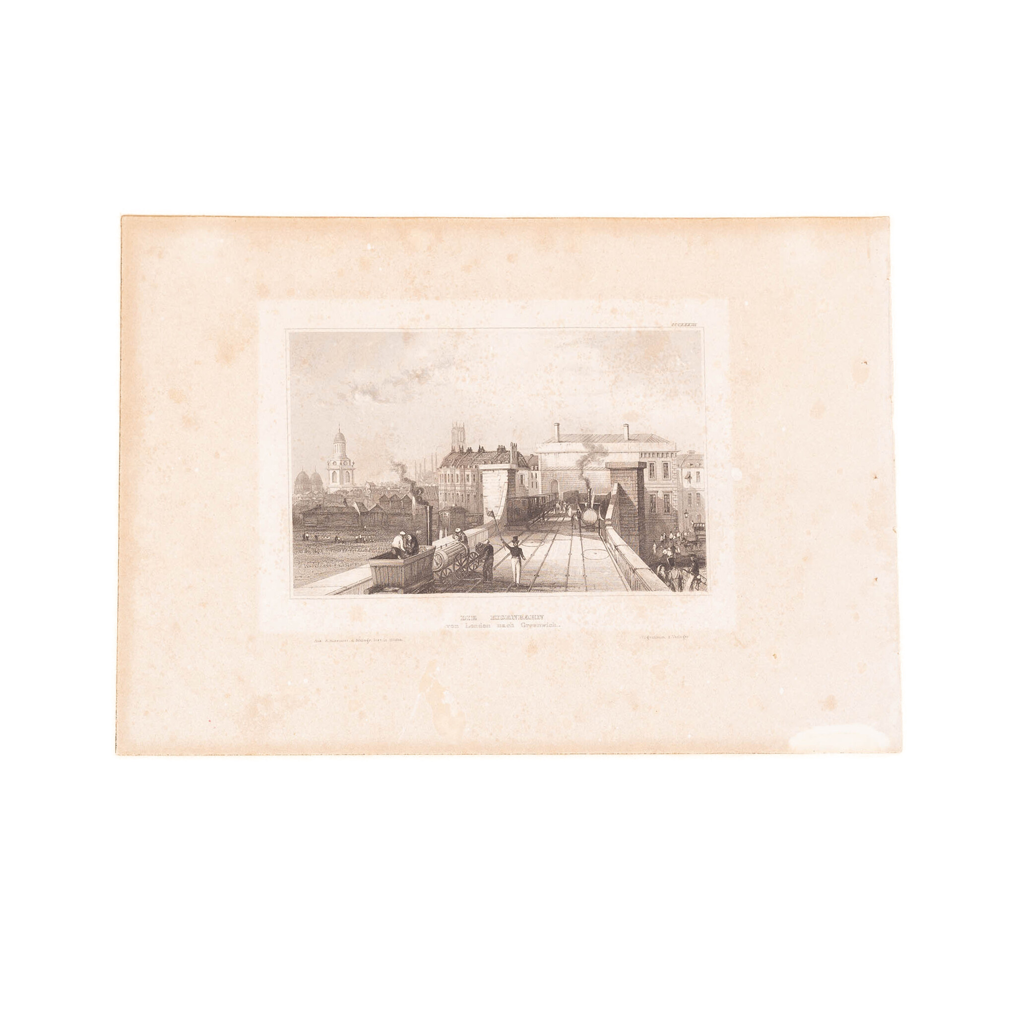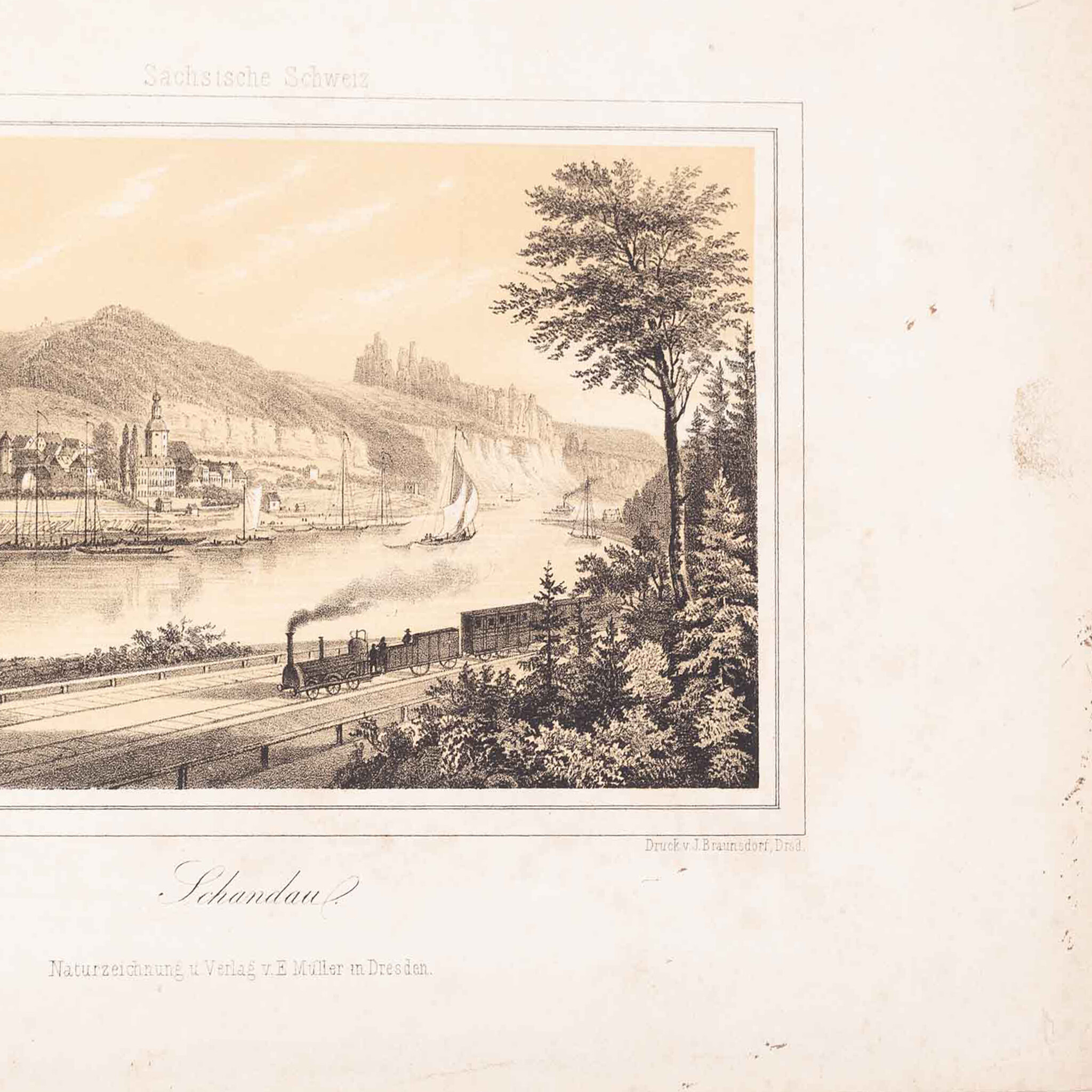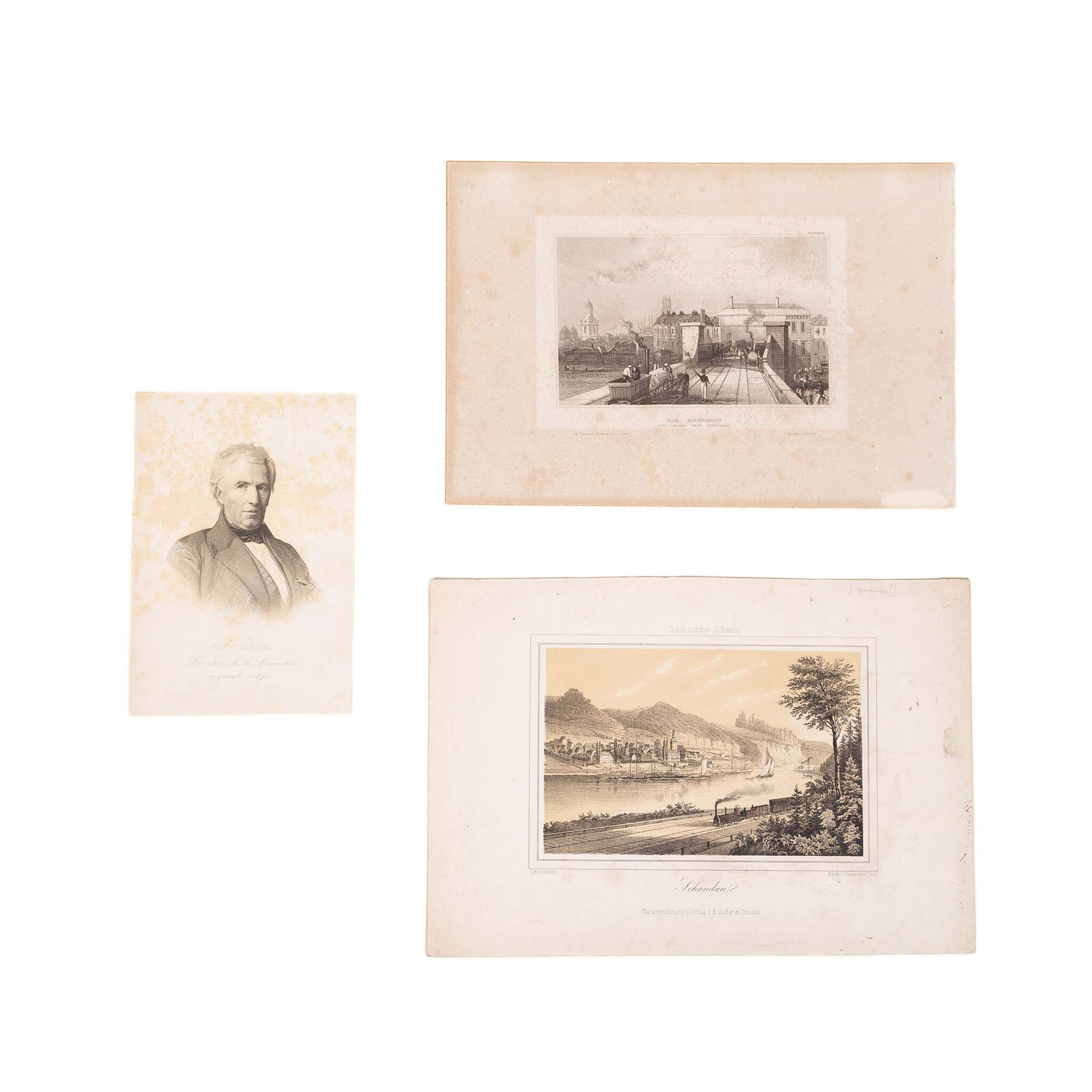Drie prenten met een treinthema: 'Marc Séguin. Inventeur de la Locomotive à grande vitesse'. Staalgravure door L. Melois van Marc Seguin (1786 - 1875), een Franse ingenieur. Hij vond in 1824 samen met zijn broer Camille (1793-1852) de hangbrug uit en hij ontwierp de eerste spoortunnels in Frankrijk. Datering: eind 19e eeuw; 'Die Eisenbahn von London nach Greenwich', Bibliographisches Institut, Hildburghausen. Gravure en ets van het gezicht op de spoorweg van Londen naar Greenwich, met Greenwich op de achtergrond. Datering: ca. 1840; Sächs Schweiz. 'Schandau'. Litho van C.W. Arldt, druk van J. Braunsdorf, uitgegeven door E. Müller in Dresden. Zicht op de Saksisch-Boheemse Spoorweg, Sächsisch-Böhmische Staatseisenbahn. Datering: circa 1850. Conditie: De prenten hebben sporen van ouderdom. Verkleuring, veel vlekken en kleine beschadigingen aan de randen. Afmetingen van papier prenten: ca. 17 x 12 cm; 19 x 28 cm; ca. 20 x 29 cm.
