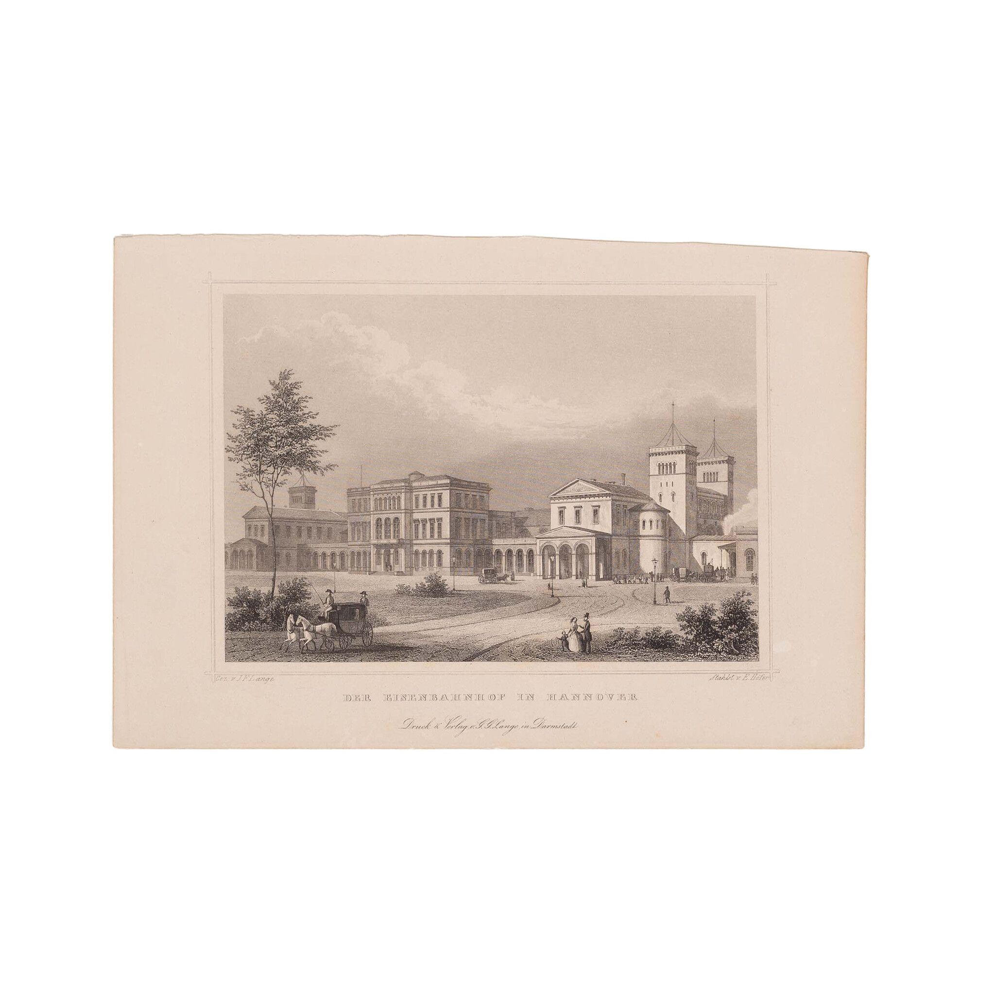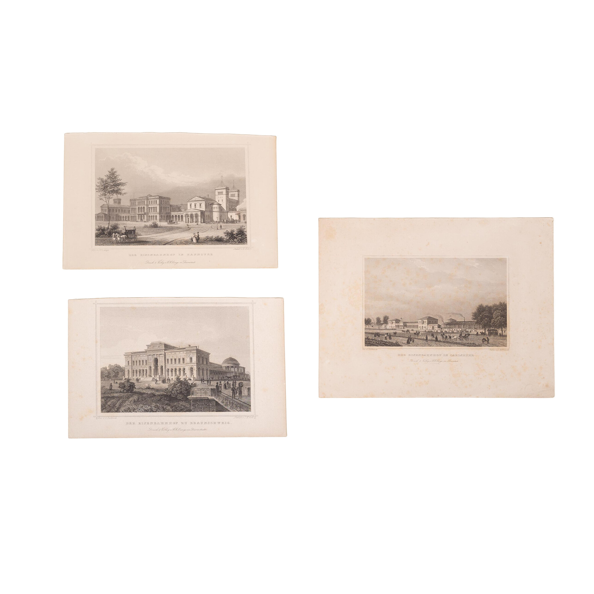 Drie prenten van een treinstation in Duitsland: 'Der eisenbahnhof in Hannover'. Staalgravure door E. Höfer naar een ontwerp van J.F. Lange, uitgegeven door G.G. Lange in Darmstadt. Datering: circa 1850; 'Der Eisenbahnhof in Carlsruhe'. Staalgravure van L. Hoffmeister, uitgegeven door G.G. Lange in Darmstadt. Datering: circa 1850; 'Der eisenbahnhof zu Braunschweig'. Staalgravure door J.M. Kolb naar een ontwerp van L. Rohbock, uitgegeven door G.G. Lange in Darmstadt. Datering: circa 1860. Conditie: De prenten hebben sporen van ouderdom. Verkleuring, vlekken en kleine beschadigingen aan de randen. Afmetingen van papier: prent Hannover ca. 14,5 x 23 cm, prent Carlsruhe ca. 20 x 26 cm, prent Braunschweig ca. 14,5 x 23 cm.