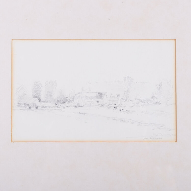 Set van drie potloodtekeningen op papier met landschappen door Piet Bruinsma uit 1984. Dordtse kil, Groothoofd en Polderlandschap; alle in houten lijst. Conditie: de werken zijn hier en daar verkleurd aan de randen door zuurhoudend passe partout en alle lijsten tonen gebruikssporen; bij een lijst zit de achterplaat los. Afmetingen: werk 12,5 x 18,5 cm; 13 x 19 cm en 12 x 19 cm, lijsten zijn 36,5 x 42 cm.