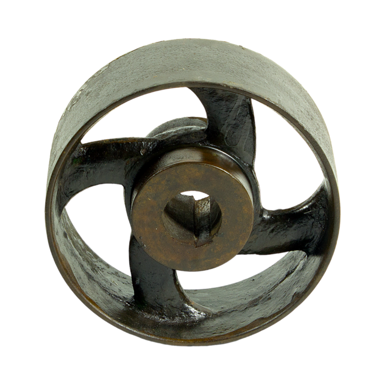 Drijfwiel met 4 spaken, voor machine, van metaal. Datering: onbekend. Conditie: goed. Afmetingen: ca. ø20,0 x 7,5 cm.