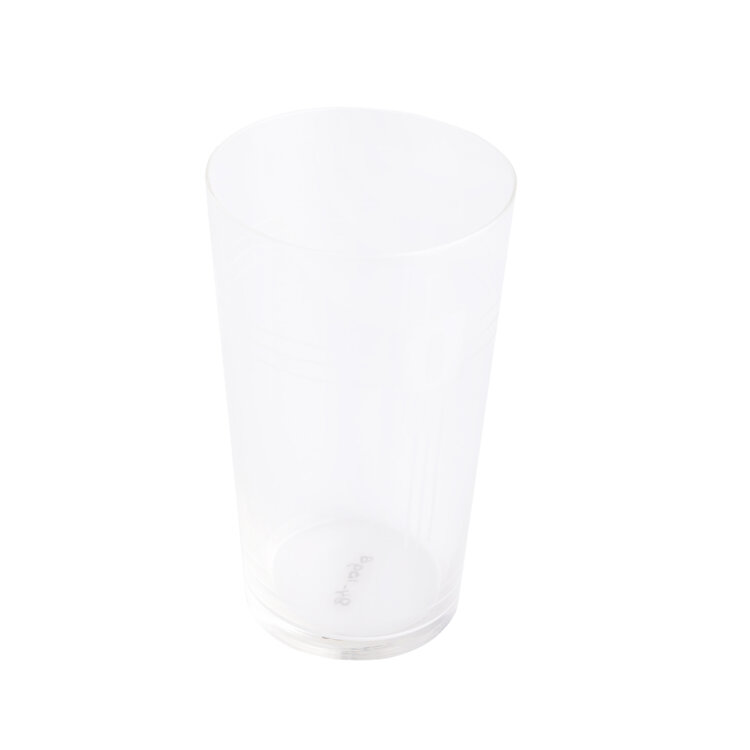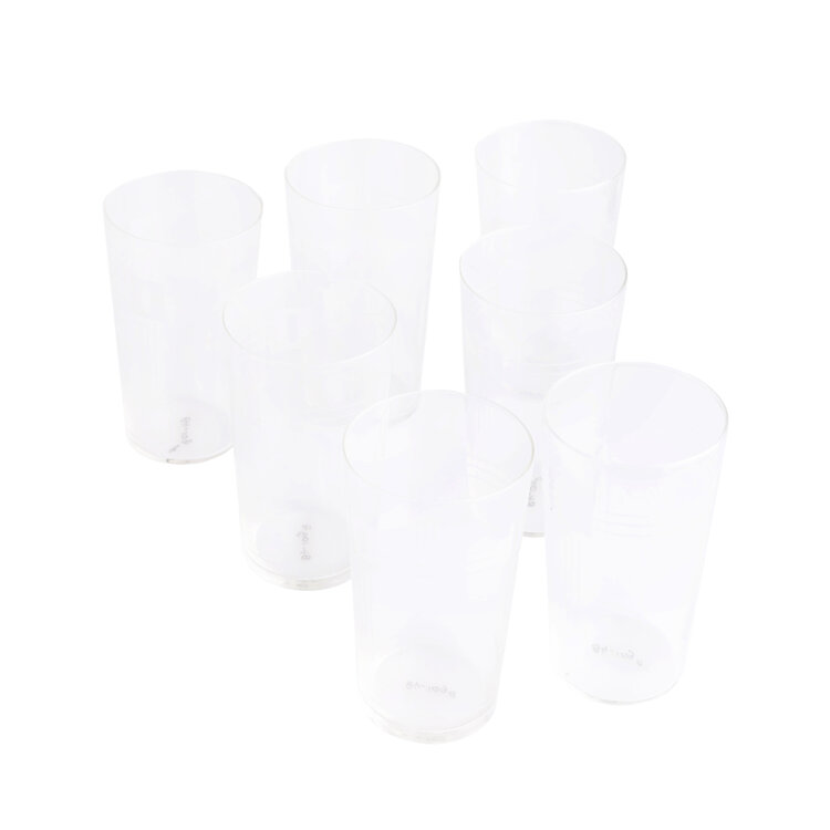 Drinkglazen, 7 stuks. Bekermodel met geëtst motief en lijnen. Aan de onderzijde gemerkt met het inventarisnummer van het museum. Datering onbekend. Conditie: bij 2 stuks is de bovenrand licht beschadigd. Afmetingen: ca. 9,5 x 5,5 cm.