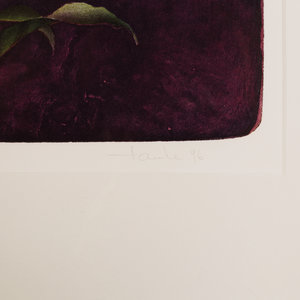 E. Hanke, Klarinet, 1996. Steendruk in metalen lijst, oplage e.a. Afbeelding van een vriesea voor donkere achtergrond, waar een klarinet in zichtbaar is. Linksonder met potlood e.a., rechtsonder signatuur en jaar. Conditie: gebruikssporen aan lijst. Afmeting werk zonder lijst: 40 x 50 cm, incl. lijst: 74 x 63 cm.