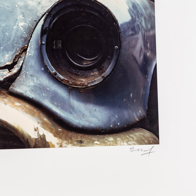 E.A. Hof, Auto-oog, jaartal onbekend. Kleurenfoto in metalen lijst. Close-up van een koplamp van een blauwe auto waar de lamp van verwijderd is. Signatuur rechtsonder. Conditie: goed, gebruikssporen aan lijst. Afmeting: 30 x 41 cm.