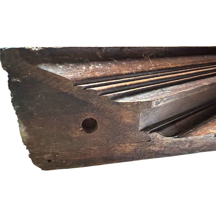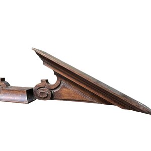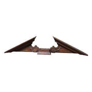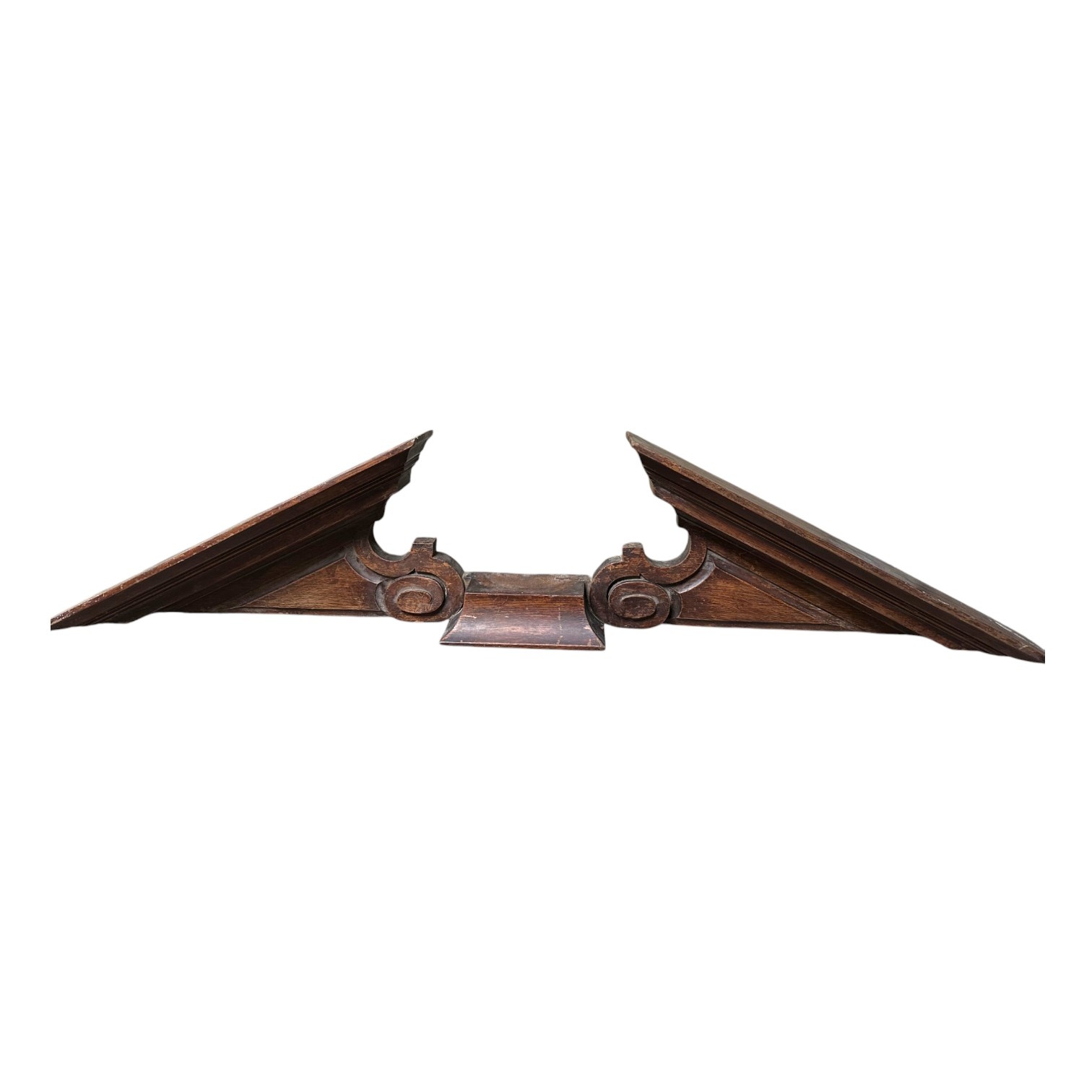 Decoratief eikenhouten element van een kast, 20ste eeuw. Een gebroken pediment, een driehoekige bekroning van een kast. Conditie: gebruikssporen. Afmetingen: l 150 cm, h 30 cm, br 12 cm.