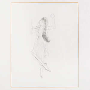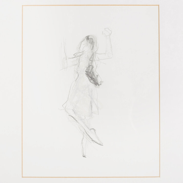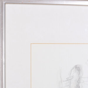 Ellen Bensch, Movement III, jaartal onbekend. Schets op papier met dansende figuur in passe-partout met zilverkleurige lijst. Afmetingen: 31 x 42 cm. Conditie: Lijst toont sporen van gebruik.