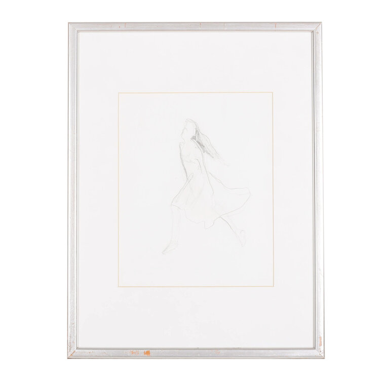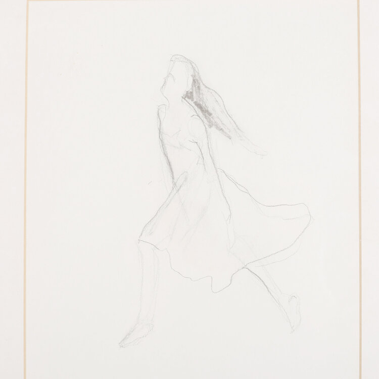 Ellen Bensch, Movement IV, jaartal onbekend. Schets op papier met dansende figuur in passe-partout met zilverkleurige lijst. Afmetingen: 31 x 42 cm. Conditie: Lijst toont sporen van gebruik.