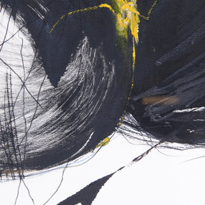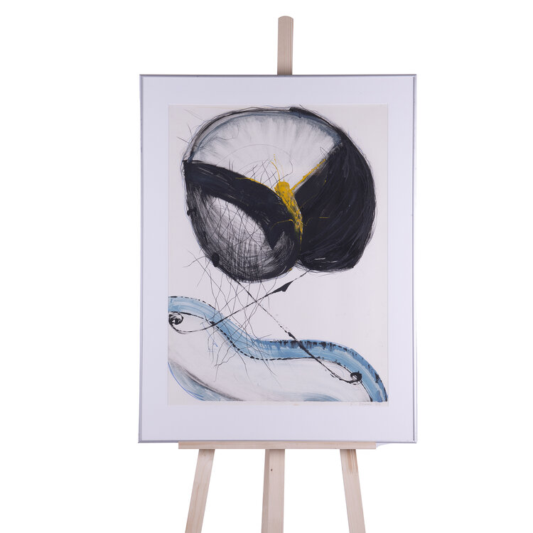 Groot werk getiteld Hoogtezon, van de hand van Elma van Haren. Het werk toont een geabstraheerde compositie waarin gele, blauwe en zwarte tinten overheersen. Gemengde technieken op papier. Datering: 1984. Conditie: goed, de lijst heeft krassen. Afmetingen: 80 x 60 cm.