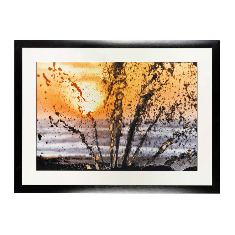 Els Bax, Kustversterking Noordwijk 2007-2008, 2008. Kleurenfoto in zwart metalen lijst. Afbeelding van opspuitend water voor een oranje lucht met zon tijdens de werkzaamheden van de kustversterking van Noordwijk in 2007-2008. Conditie: goed, lichte gebruikssporen aan de lijst. Afmetingen: werk 39 x 59 cm, lijst 55 x 75 cm