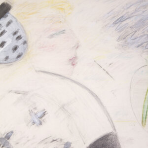 Een voorstelling met een vrouwenfiguur en een vaas bloemen. Pastel op papier. Datering: omstreeks 1984. Conditie: waterschade rechtsonder, de lijst heeft krassen en andere gebruikssporen. Afmetingen: 70 x 90 cm.