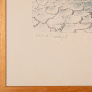 Els van der Graaf, 'Teken in Landschap 3', 1977. Litho oplage 12, in houten lijst. Afbeelding van een landschap met een gebarsten grond op de voorgrond en heuvels op de achtergrond. In het landschap staat een houten constructie. Titel linksonder. Signatuur, oplage en datum rechtsonder. Conditie: lijst vertoont gebruikssporen, plakbandresten op glasplaat. Afmetingen: ca. 67,5 x 52,5 x 1,5 cm.