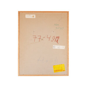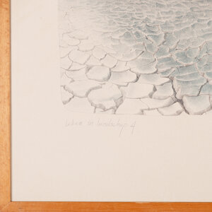 Els van der Graaf, 'Teken in Landschap 4', 1977. Litho oplage 12, in houten lijst. Afbeelding van een landschap met een gebarsten grond op de voorgrond en heuvels op de achtergrond. In het landschap staat een houten constructie. Titel linksonder. Signatuur, oplage en datum rechtsonder. Conditie: lijst vertoont gebruikssporen. Afmetingen: ca. 67,5 x 52,5 x 1,5 cm.