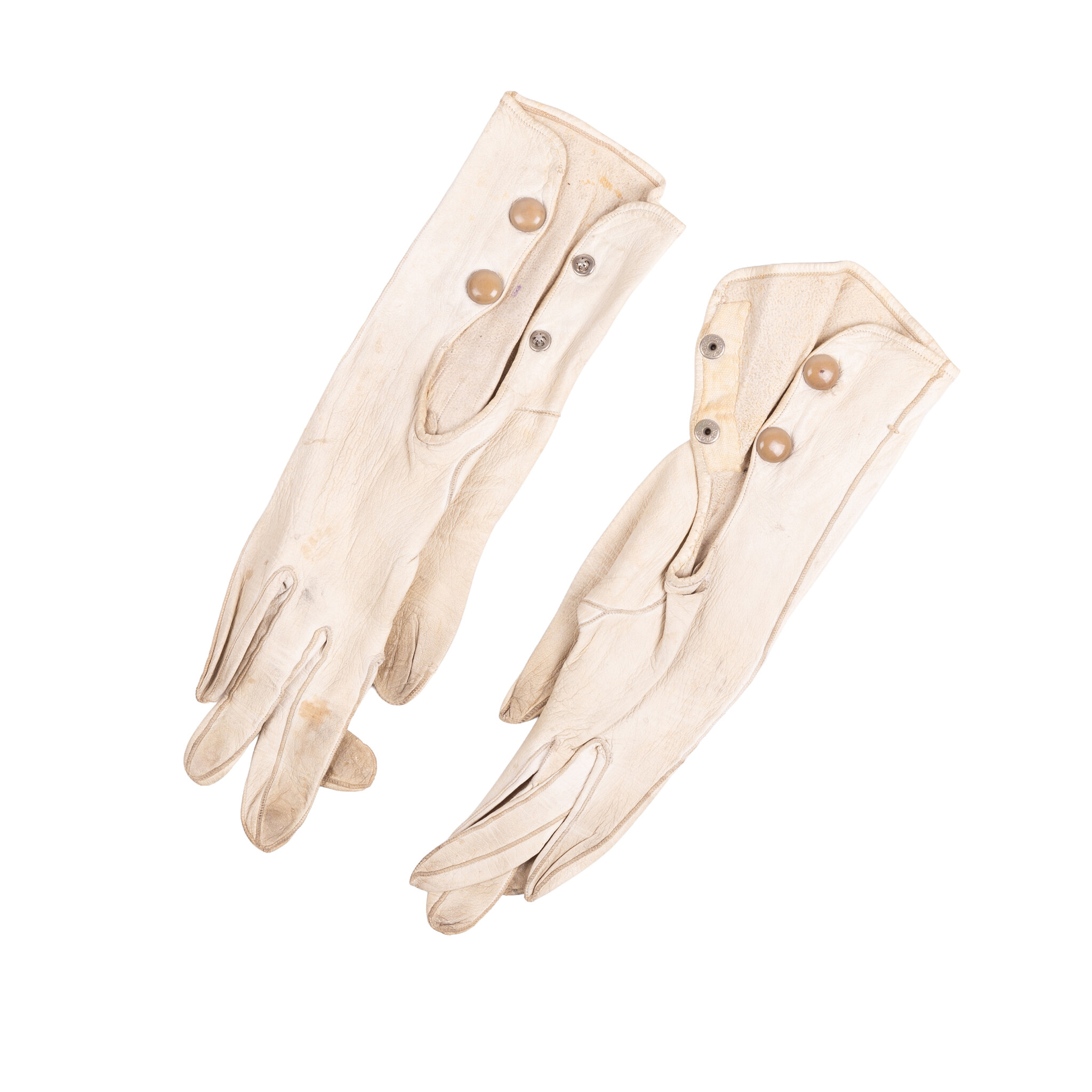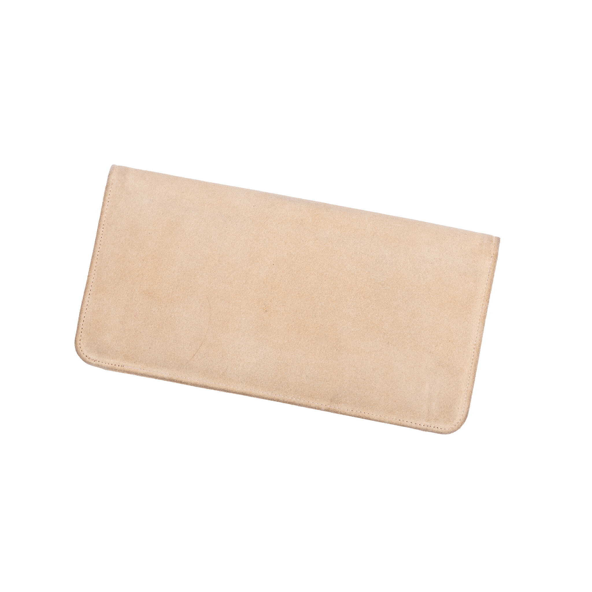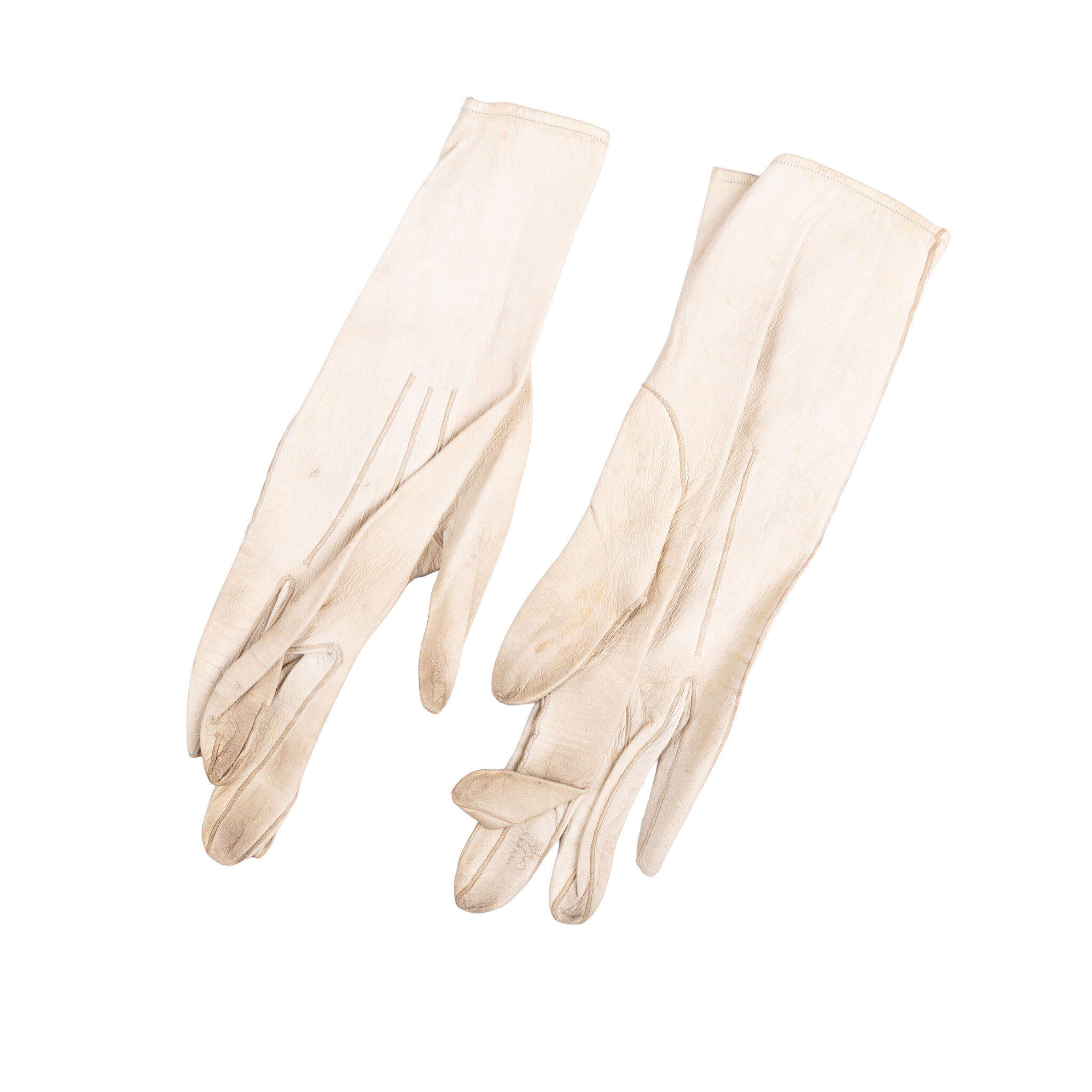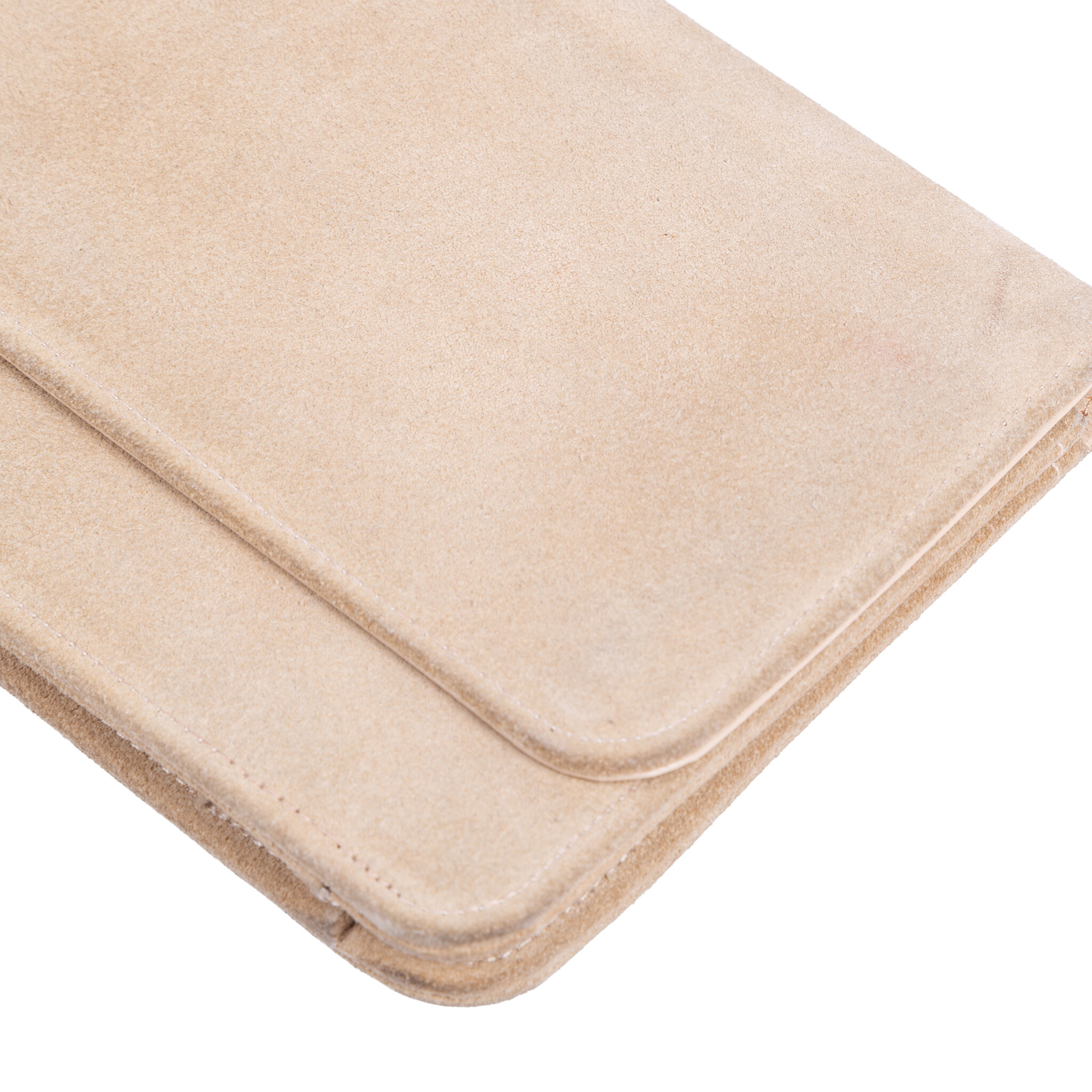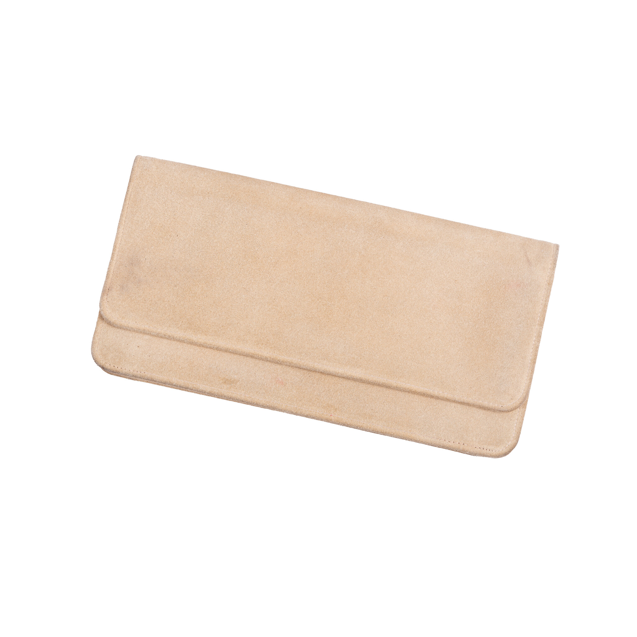 Set met beige enveloptas en handschoentjes, 20ste eeuw. De tas is van suède, heeft een klepsluiting met drukknoop en aan de binnenzijde een opbergvakje. De leren handschoentjes hebben bruine drukknoopjes. Conditie: vertonen sporen van gebruik, zoals vlekken; de handschoentjes hebben scheurtjes langs de naadjes. Afmetingen clutch: ca. 12 x 23,5 x 1,5 cm. Afmetingen handschoentjes: ca. 25 x 9 cm.