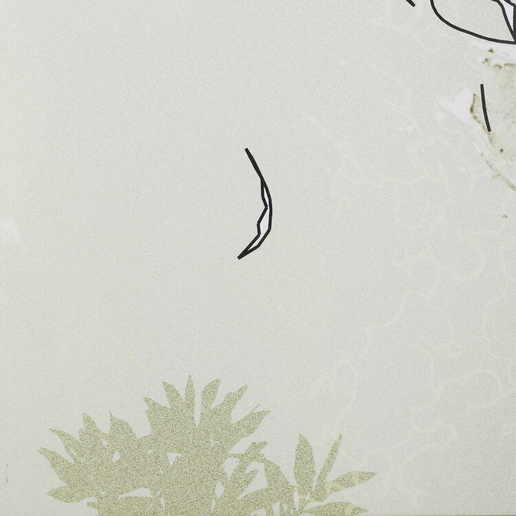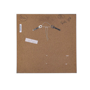 Eric Jarlsson, zonder titel, jaartal onbekend. Foto in zilver kleurige lijst. Abstracte compositie van zwarte lijnen voor een licht blauw-groene achtergrond. Conditie: gebruikssporen aan de lijst. Afmeting foto: 49 x 49 cm.