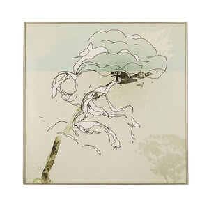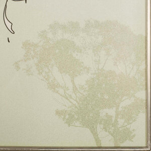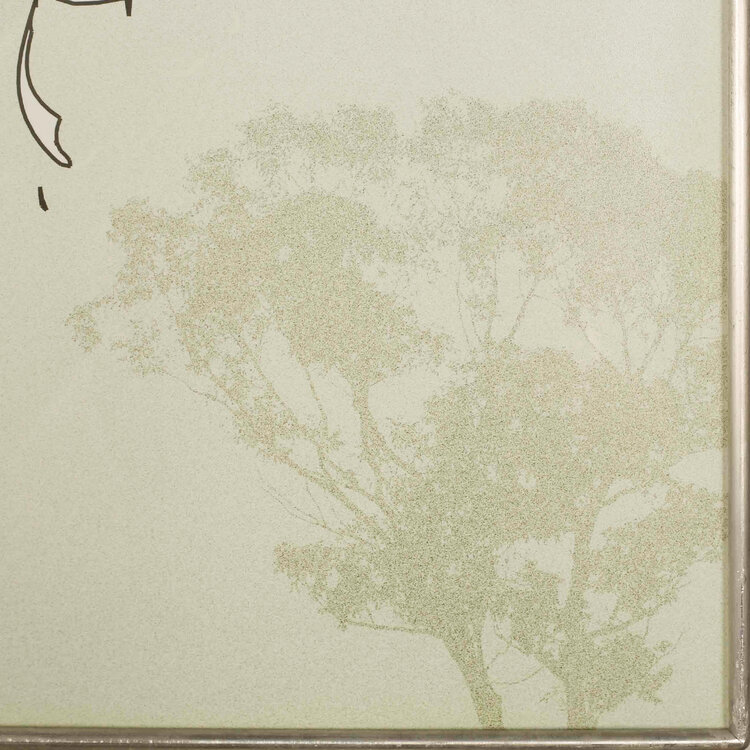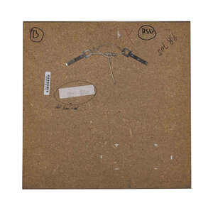 Eric Jarlsson, zonder titel, jaartal onbekend. Foto in zilver kleurige lijst. Abstracte compositie van zwarte lijnen voor een licht blauw-groene achtergrond. Conditie: gebruikssporen aan de lijst. Afmeting foto: 50 x 50 cm.