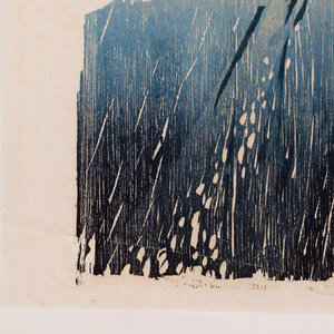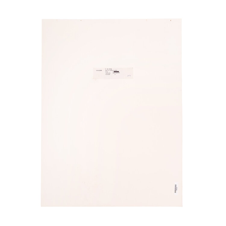 F. de Jong, Man in vallend water, 1984. Houtsnede op papier zonder lijst, oplage 1/20. Voorstelling in blauw, rood en beige met rood merkteken in de linkerbovenhoek. De voorstelling doet denken aan een man tegen een berglandschap. Conditie. Het werk is in prima conditie, wel zijn er vouwen aan de bovenzijde. Afmetingen: ca. 70 x 50 cm.