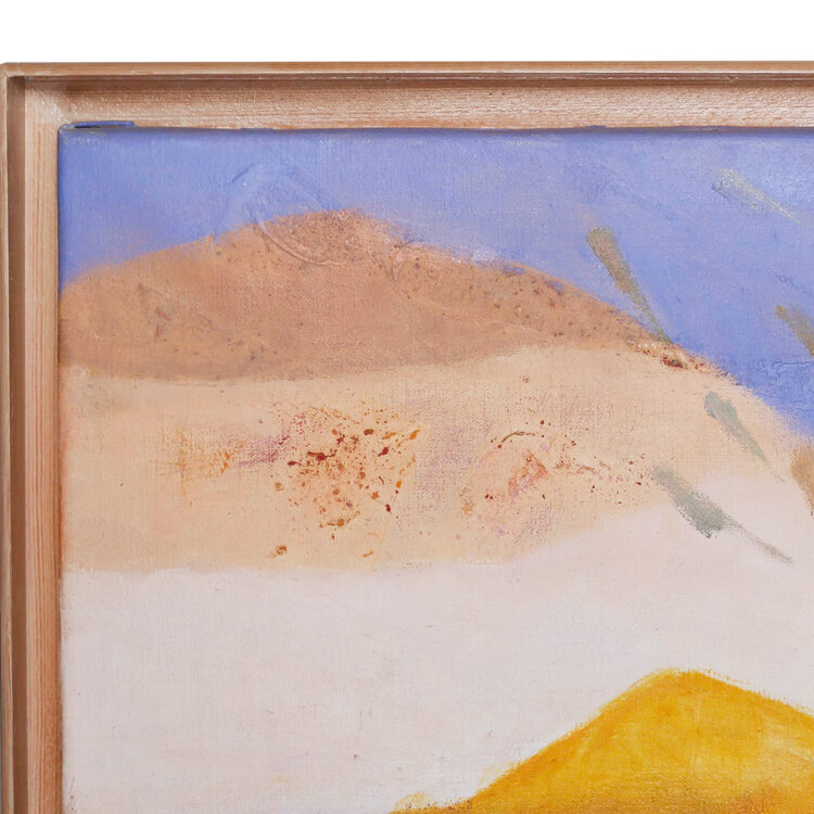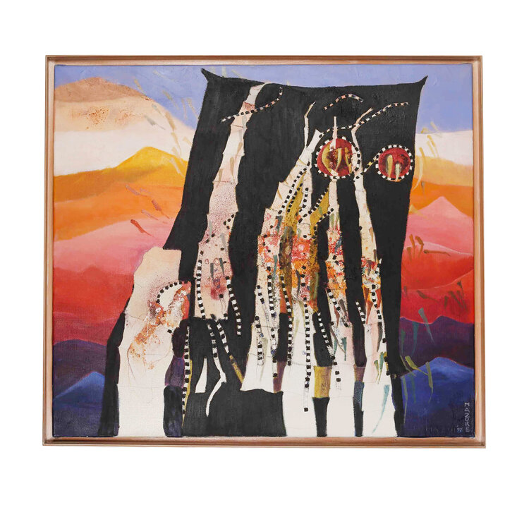 Fanny Mazure, De magie van bamboe, 1997. Olieverf op doek met houten lijst. Geabstraheerde voorstelling van bamboe voor kleurrijk berglandschap. Afmetingen: 84 x 94 cm. Conditie: Lijst toont sporen van gebruik.