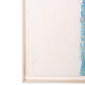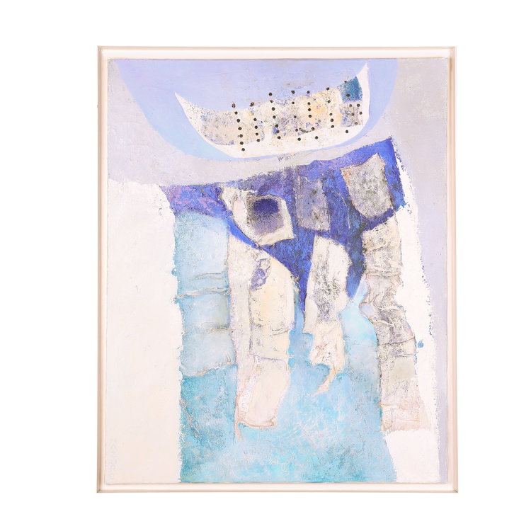 Fanny Mazure, Maanlandschap, jaartal onbekend. Mixed media met olieverf op doek. Linksonder signatuur. Abstracte voorstelling in diverse tinten blauw met wit. Conditie: Lichte gebruikssporen en craquelé in de verf. Afmeting werk zonder lijst: 100 x 80 cm.