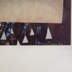 Fanny Mazure, Zonder titel, 1983. Gemengde techniek op papier in metalen lijst. Abstracte voorstelling in blauw, bruin, wit en rood. Signatuur en jaar rechtsonder. Conditie: goed, gebruikssporen aan lijst. Afmeting lijst: 99 x 67 cm.